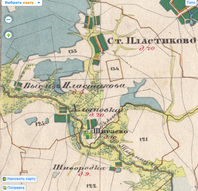 « с. Старое Пластиково : Селением Хмельницкаго оврага на левой и по обе стороны речки Хлыниной. Церковь деревяная во имя Рожества Пресвятыя Богородицы и 2 дома господских деревянныя: первой – статской советницы Левашевой, второй – лейтенанта Протасьева. А дачею простерается по берегам речек Несевки, Раподовки, Тынореца на правой, а Песочна на левой, и по обе стороны речки Хлыниной. Те речки в летнее жаркое время глубиною бывают: Тынорец глубиною в 1/2 сажени, шириною в 3 сажени; Песочня глубиною в 2 вершка; Раподовка и Хлынина глубиною в аршин, шириною в сажень. Земля иловатая. Ис посеянаго по удабриванию на ней хлеба лутче родится рожь, овес и греча, а другия семена и сенныя покосы средствены." - там же.