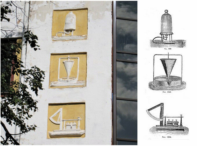 Слева - барельефы на фасаде административного здания завода "Физприбор" (улица Герцена, 41). Справа - изображенные на барельефах приборы, илллюстрации из каталога мастерской учебных пособий Вятского губернского земства (1912 год), сверху вниз: