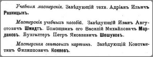 Рассмотрим вкратце перечень учебных пособий мастерской. Из школьной мебели: парты для начальной школы, учительские столы, кафедры, книжные шкафы и классные доски. Из пособий при начальном обучении: счеты и арифметические ящики, коллекции мер длины, классные линейки и рулетки, коллекции мер веса, аптекарские и торговые весы, меры емкости, учебные циферблаты. Из школьных пособий по геометрии и черчению: наборы геометрических тел (из дерева и папье-маше), классные циркули, угольники, транспортиры и масштабы, приборы для съемки планов (эккеры, астролябии, мензулы, нивелиры). Для обучения рисованию: коллекции растений, наборы объемных орнаментов, энтомологические коллекции (жуки, бабочки).