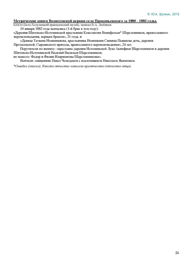 В с. Старые Зятцы Малмыжского уезда с 1863 года священником служил Михаил Иванович Шерстенников. К сожалению, я не знаю откуда его корни. Но этот человек в истории села остался настоящим просветителем. По его инициативе были созданы социальные учреждения - в начале его пути построена большая каменная церковь, затем появились школа, со временем медпункт и даже создано городское училище. Развивалась культура, так, при его поддержке был создан хор. Кстати, его дети тоже стали значимыми фигурами в наших краях. Было бы интересно узнать, является ли Михаил Иванович родственником вашей ветви Шерстенниковых.