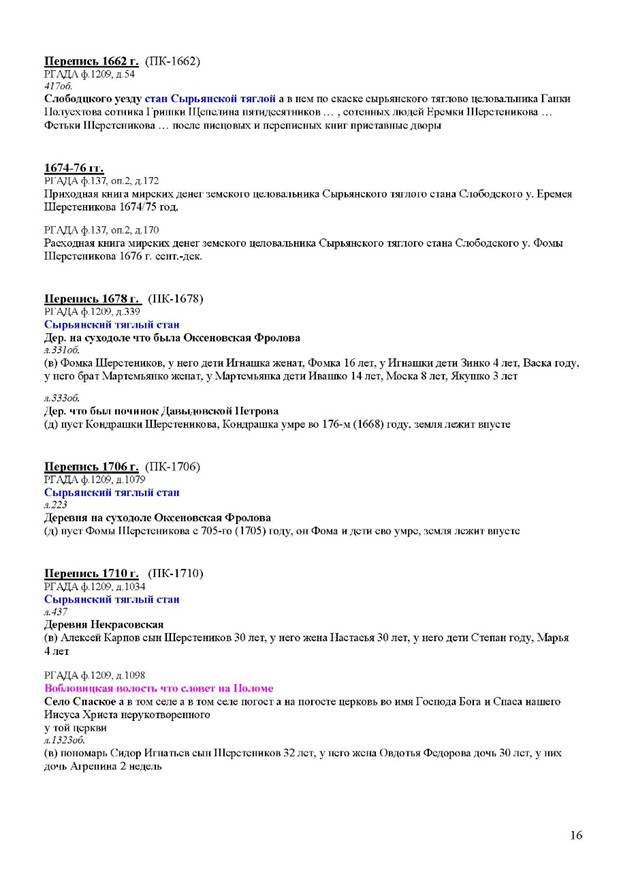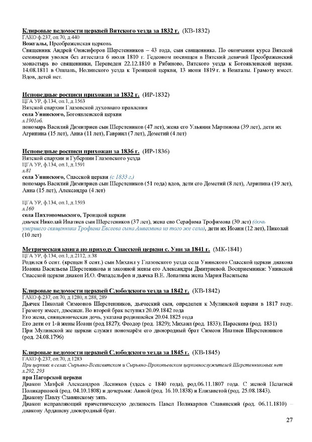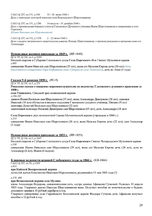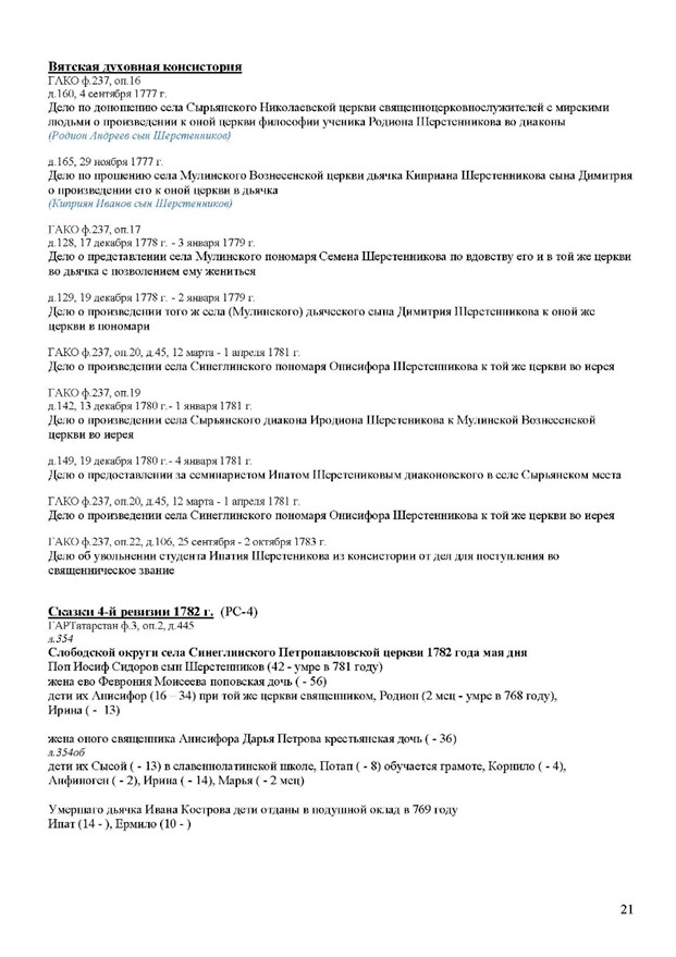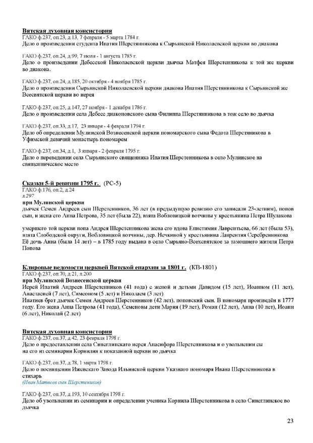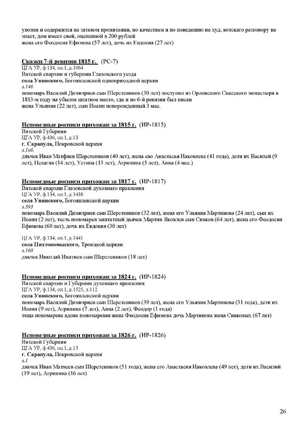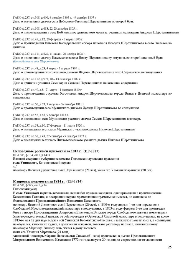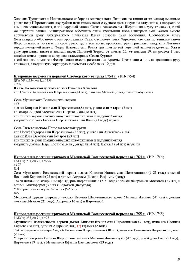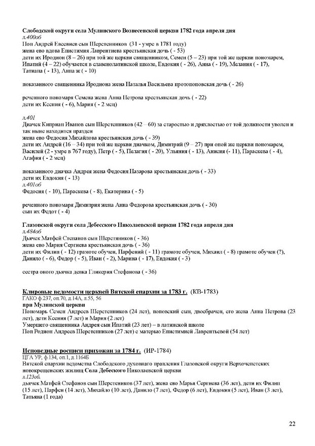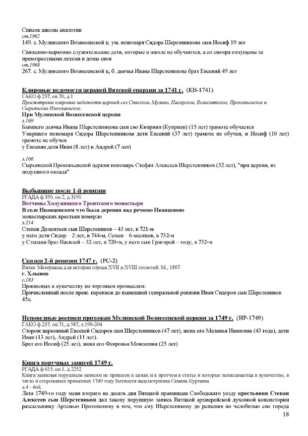Примечание:2.у дьячка Ивана Чермных жена Елисавета Поликарпова померла марта 18 дня, а июля 14 дня вступил он во второй брак с девицою села Святопольского, умершего дьячка Николая Шерстенникова дочерью Анною. Извиняюсь, что только из этой информации поставил ее год рождения.