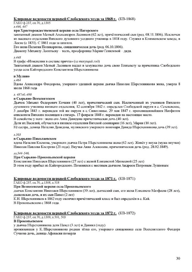 ЧЕРМНЫХ Иван Матфеев псаломщик, 1827 г.р., урож. ц. Христо-Рождественская с. Лапугино второй брак 14.07.1868 г. с Анной Николаевной Шерстенниковой, 1844 г.р. девицою села Свято польского, умершего дьячка Николая Шерстенникова дочерью. На 1859-73 гг. Большое Городище (д. Святопольская) По притокам р. Кильмеси и правой ея стороны Глазовский уезд , на 1891 г.Приход с. Святополье, Троицкая ц. Вятская губерния, Глазовский уезд, Рыбаковская волость, Титовско-Святицкое общество.