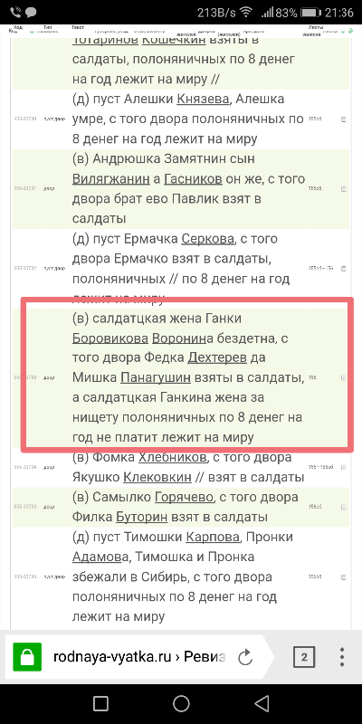 (в) салдатцкая Ивашкова жена Олферова Оверина она ж с сыном Володкою, Володка 6 лет, с того двора муж ея Ивашко да Васка Тотаринов Кошечкин взяты в салдаты, полоняничных по 8 денег на год лежит на миру //