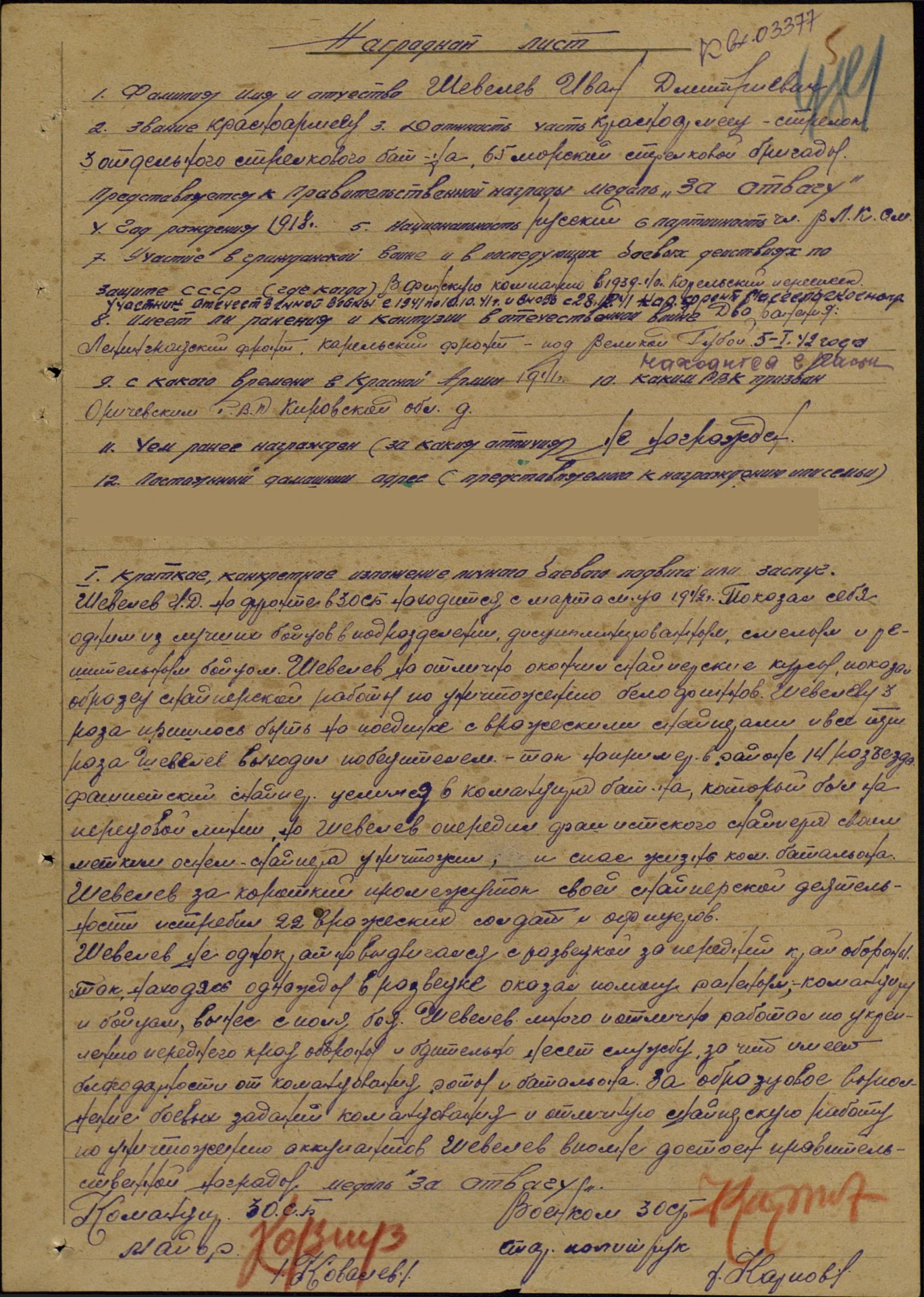 Выписка из наградного листа на медаль "За отвагу": «… показал себя одним из лучших бойцов в подразделении, дисциплинированным, смелым и решительным бойцом. Шевелев на отлично окончил снайперские курсы, показал образец снайперской работы по уничтожению белофиннов. Шевелеву 3 раза пришлось быть на поединке с вражескими снайперами и все три раза Шевелев выходил победителем… за короткий промежуток своей снайперской деятельности истребил 22 вражеских солдат и офицеров...».
