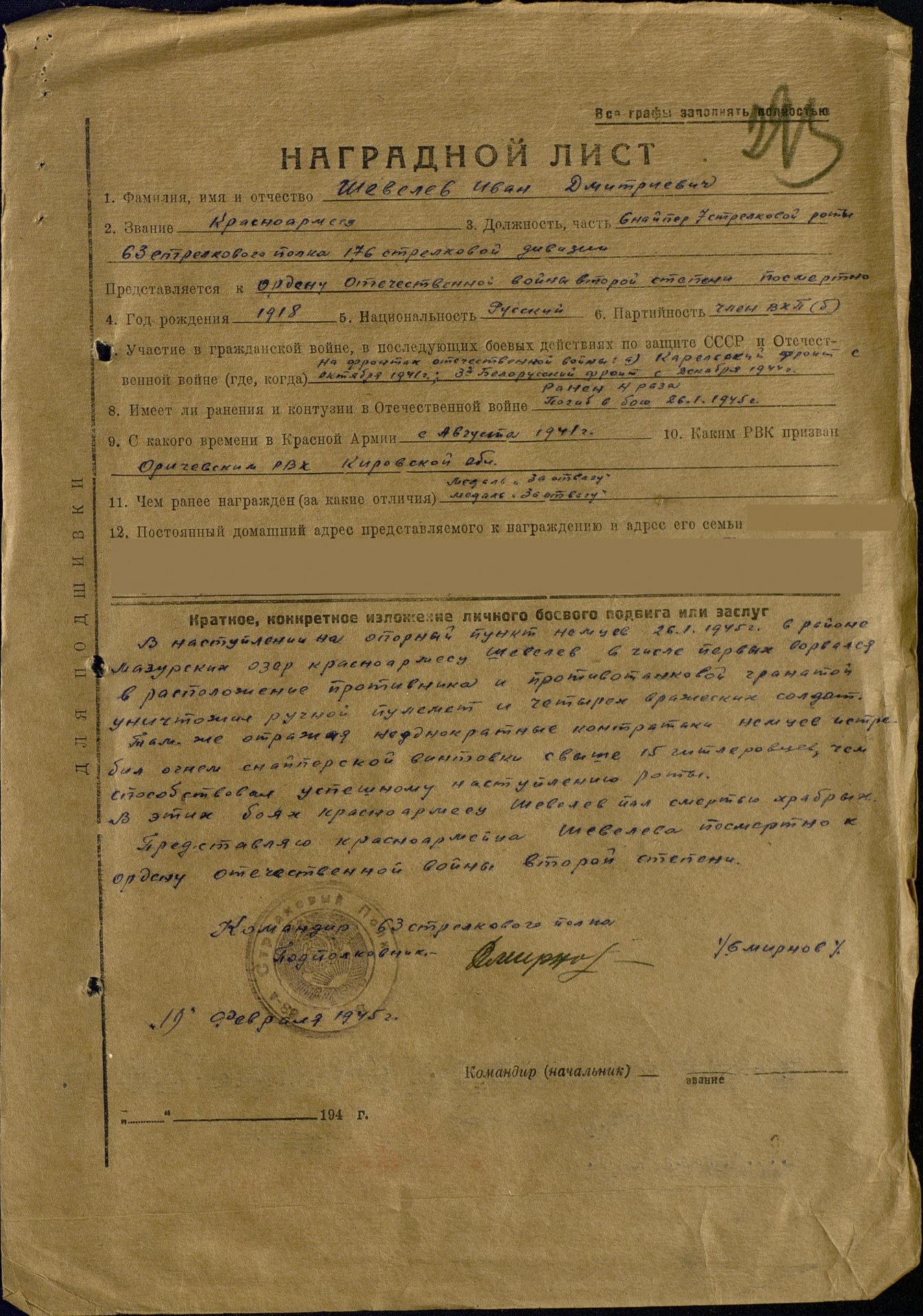| 4308483004 | ШЕВЕЛЕВ Иван Дмитриевич | 1918 г. р., д. Полом Адышевского с/с, красноармеец, сапер, 63 сп, 176 сд, 25.01.1945 г. погиб в бою. Захоронен в Восточной Пруссии, Мазурские озера, 1 км восточнее оз. Пристанен. | Кировская область, Оричевский район |