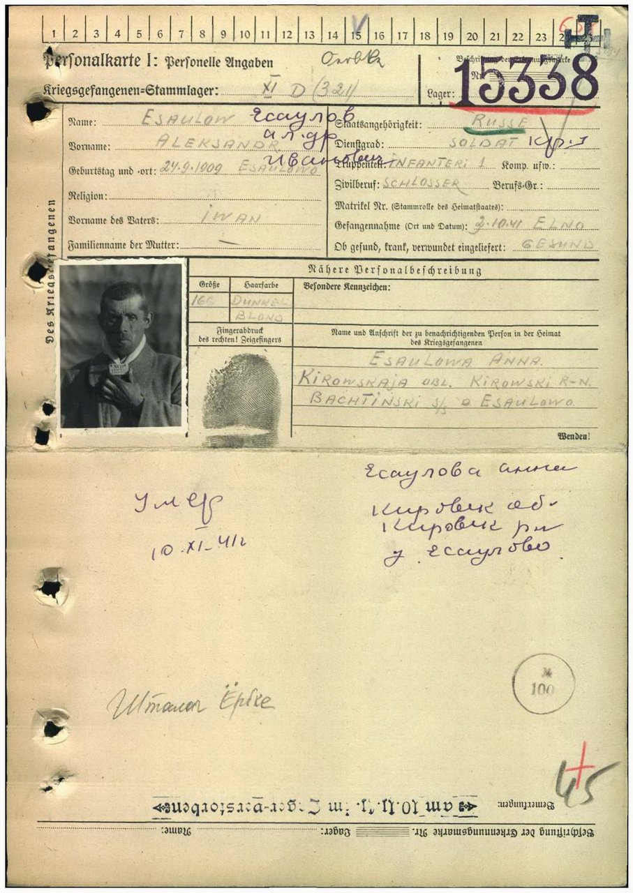 | Умер | 10.11.1941 | Stalag XI D (321) Oerbke (Эрбке, Германия) | Умер в немецком плену, в лагере военнопленных Эрбке. |