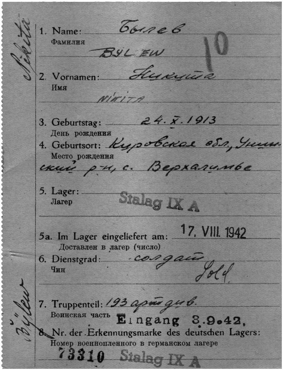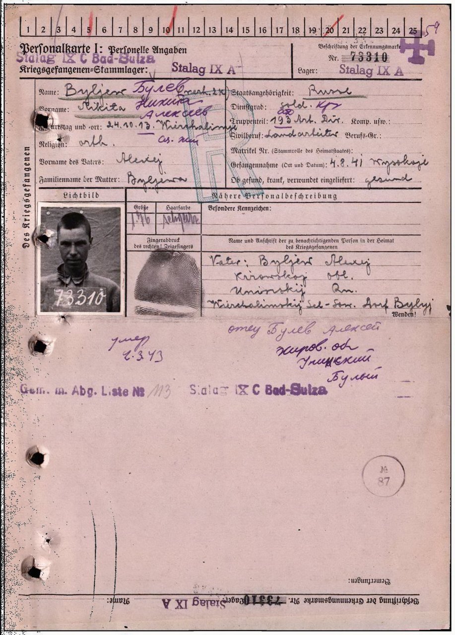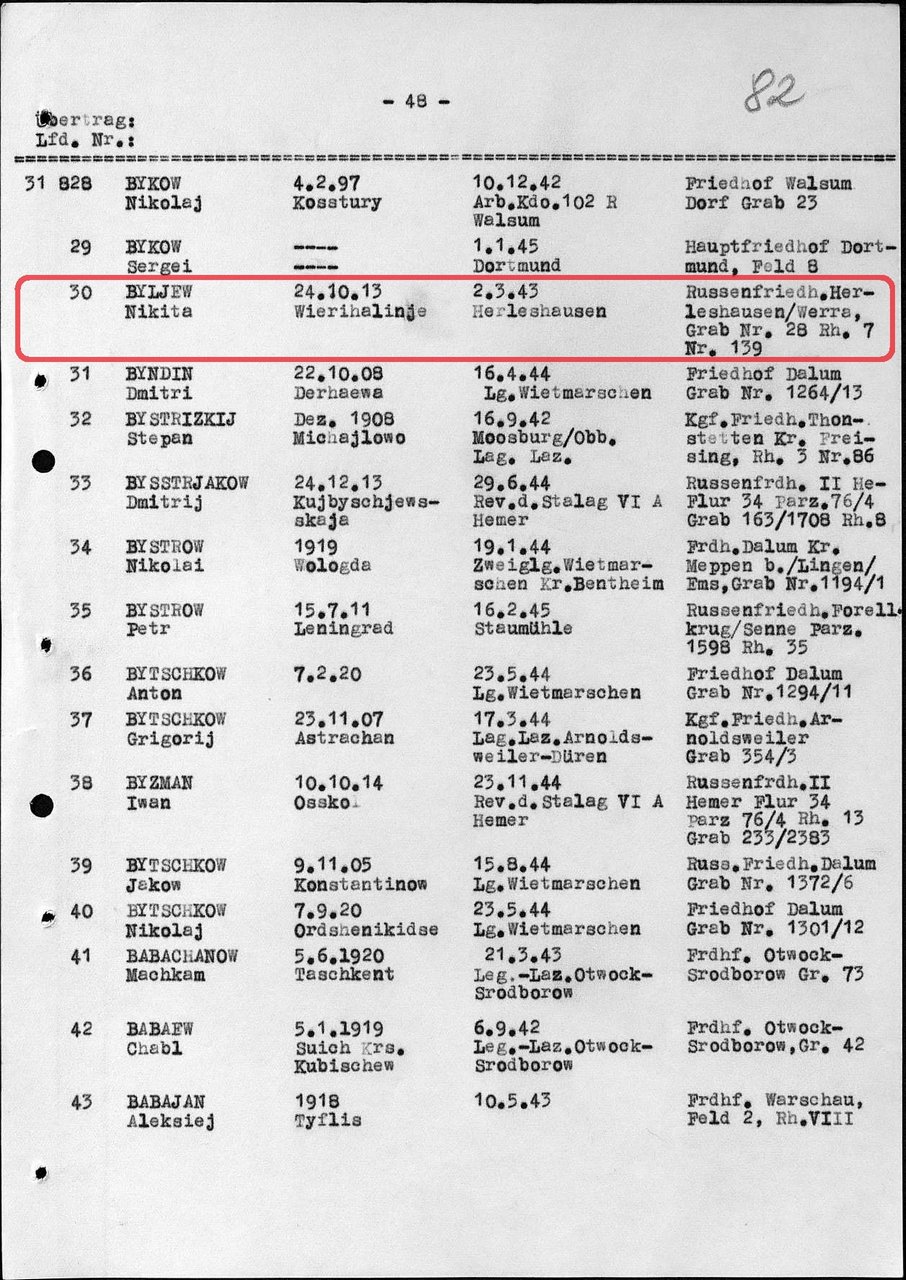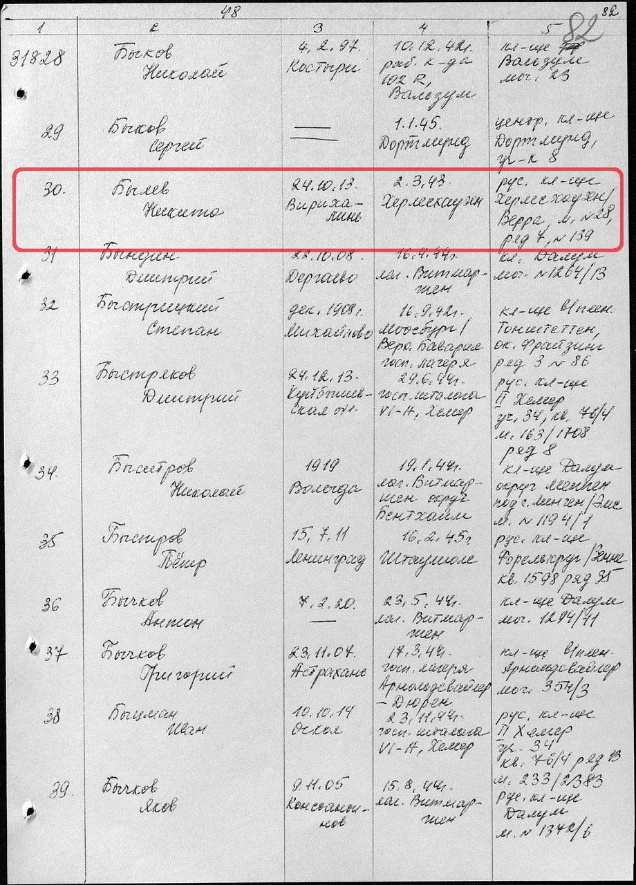 | Умер | 02.03.1943 | Kgf. Res. Lazarett Herleshausen-Werra (Херлесхаузен, Германия) | Умер в немецком плену, в лазарете Херлесхаузен-Верра. |