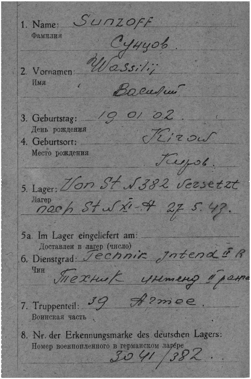 Сунцов Василий ДмитриевичСунцов Василий ДмитриевичХёрстен, Лесное кладбищеХёрстен, Лесное кладбищеХёрстен, Лесное кладбищеХёрстен, Лесное кладбищеКарта военнопленного, лицевая сторона https://www.obd-memorial.ru/html/info.htm?id=272210778&page=1Карта военнопленного, обратная сторона https://www.obd-memorial.ru/html/info.htm?id=272210778&page=2Карта военнопленного, лицевая сторона https://www.obd-memorial.ru/html/info.htm?id=272210778&page=5Карта военнопленного, обратная сторона https://www.obd-memorial.ru/html/info.htm?id=272210778&page=6Зелёная карта, лицевая сторона https://www.obd-memorial.ru/html/info.htm?id=272210778&page=3Зелёная карта, обратная сторона https://www.obd-memorial.ru/html/info.htm?id=272210778&page=4Зелёная карта, лицевая сторона https://www.obd-memorial.ru/html/info.htm?id=82717608Зелёная карта, обратная сторона https://www.obd-memorial.ru/html/info.htm?id=82717608&page=2Зелёная карта, лицевая сторона https://www.obd-memorial.ru/html/info.htm?id=82717608&page=3Зелёная карта, обратная сторона https://www.obd-memorial.ru/html/info.htm?id=82717608&page=4Лазаретная карта, лицевая сторона https://www.obd-memorial.ru/html/info.htm?id=301041018Лазаретная карта, обратная сторона https://www.obd-memorial.ru/html/info.htm?id=301041018&page=2Документ, уточняющий потери https://www.obd-memorial.ru/html/info.htm?id=72655157