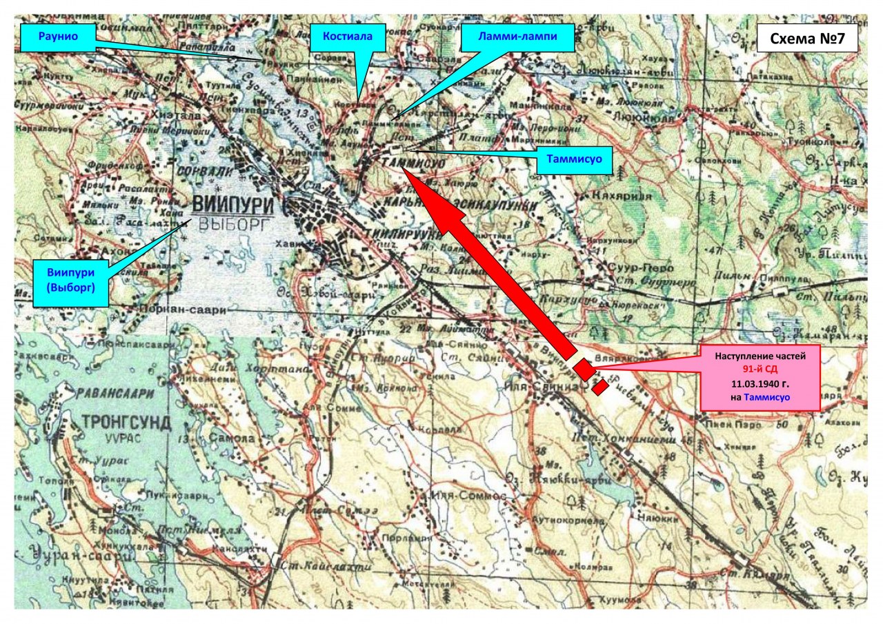 91-й дивизии приказ предписывал с 301-м гаубичным артиллерийским полком и батальоном танков 1-й танковой бригады к 24:00 час. 10.03.1940 г. занять часть полосы наступления 100-й стрелковой дивизии протяженностью в 1,5 км и атаковать противника на участке цементно-железоплавильного завода, кирпичного завода у восточной окраины Тяммисуо, нанося удар общим направлением Ламмиилампи, Раунио.