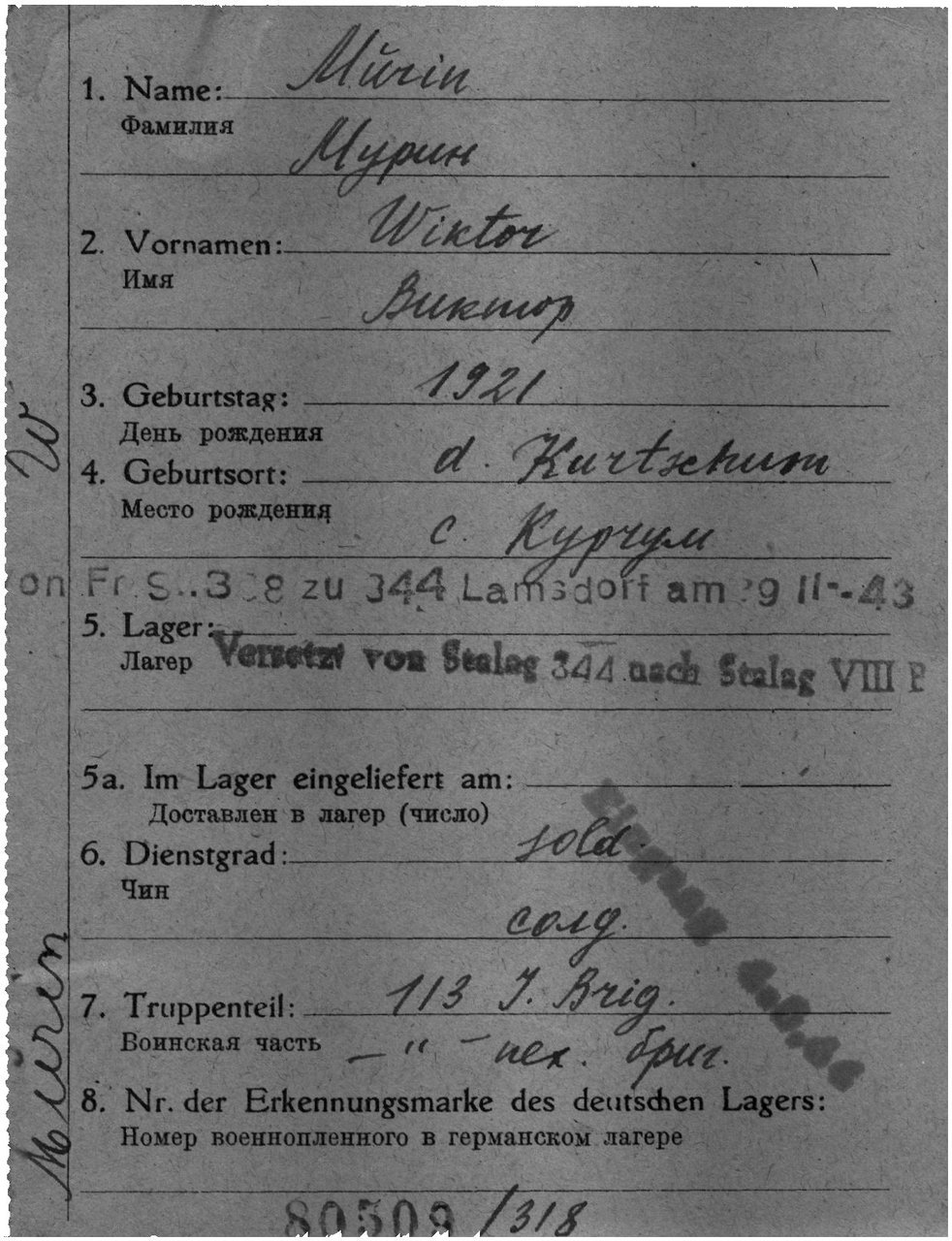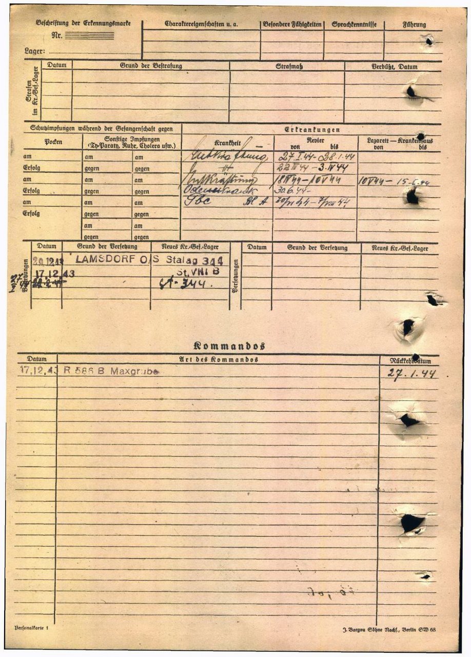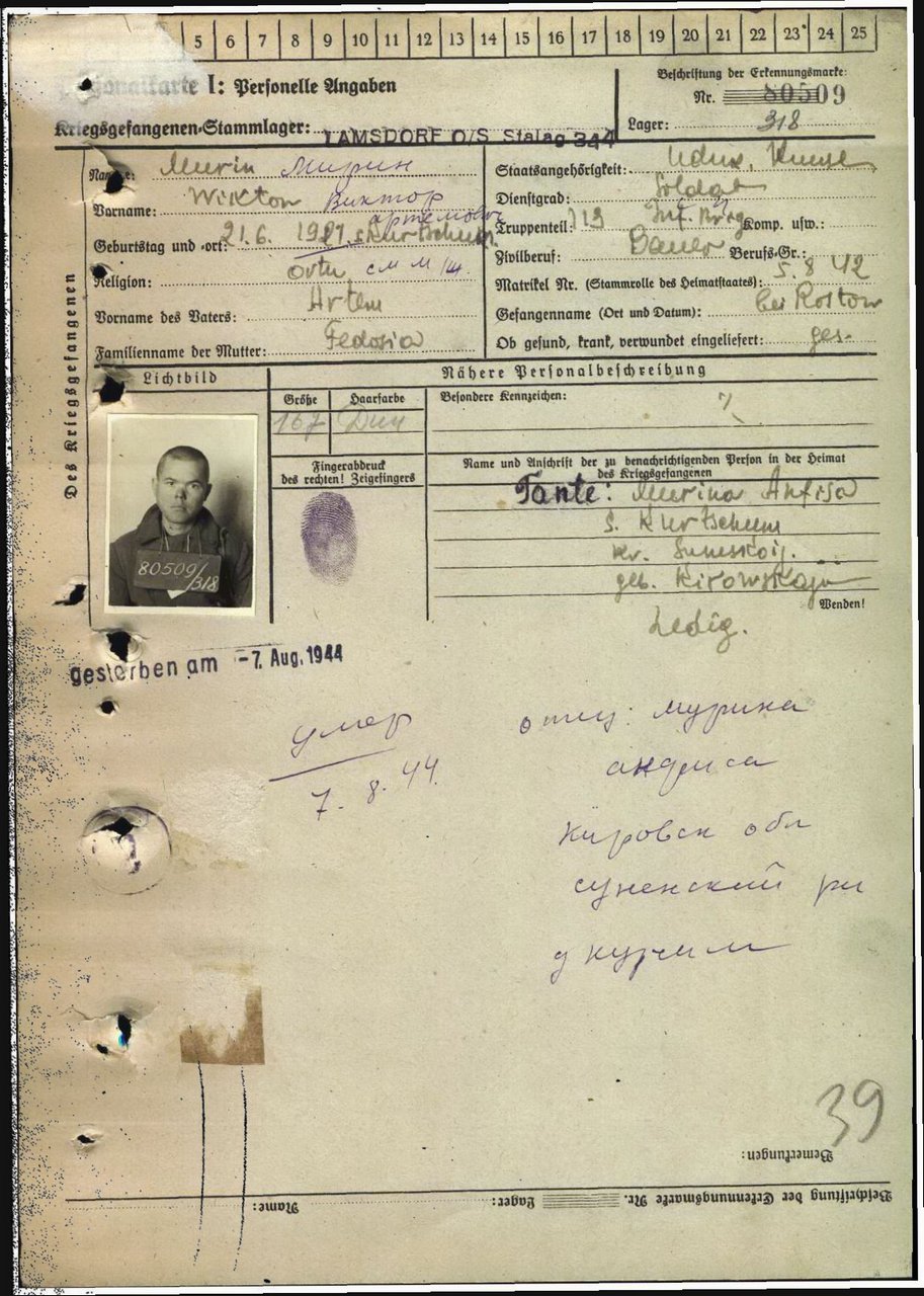 | Умер | 07.08.1944 | Stalag 344 Lamsdorf (Ламбиновице, Польша) | Умер в немецком плену, в ревире лагеря военнопленных Ламсдорф. |