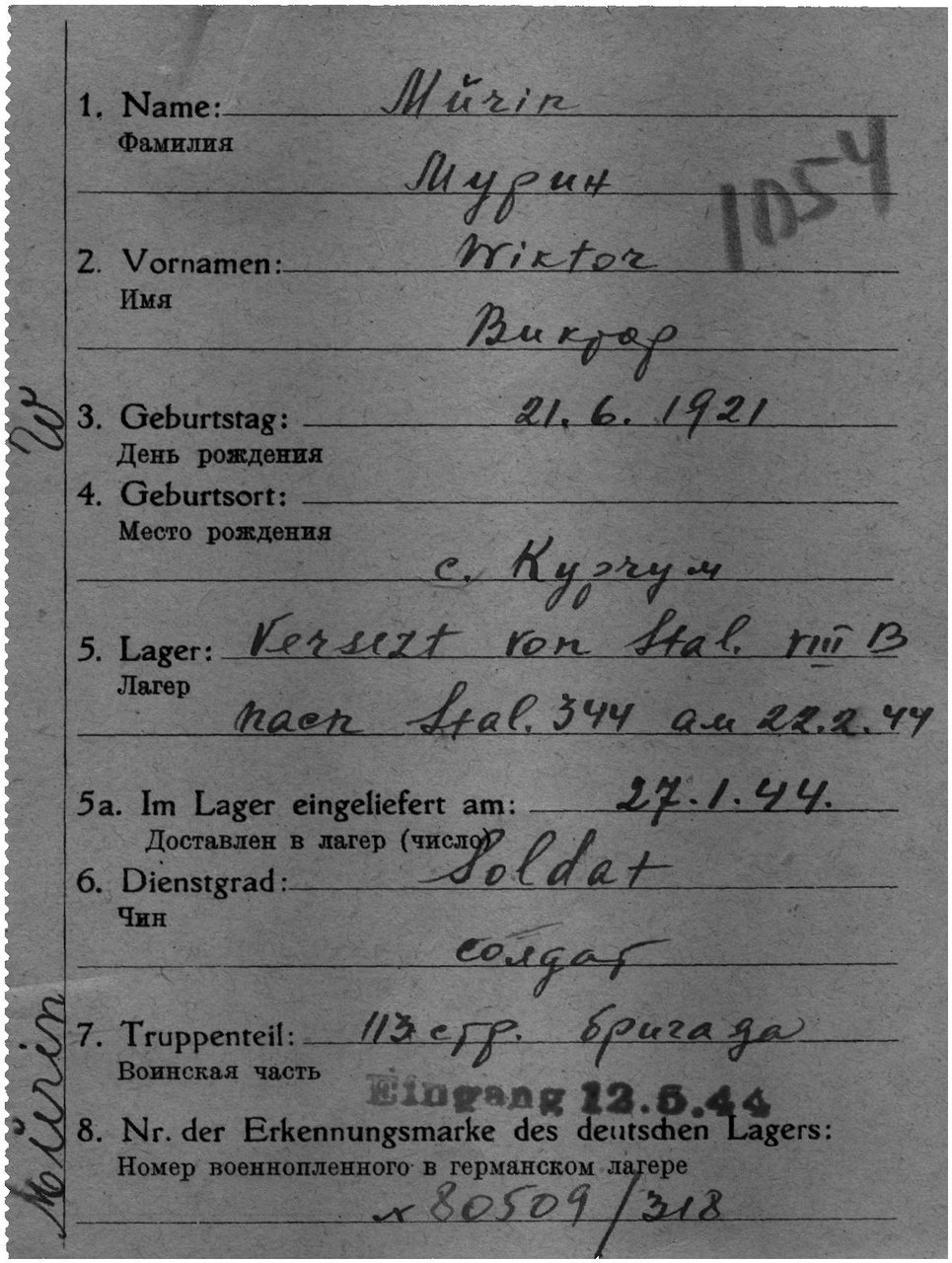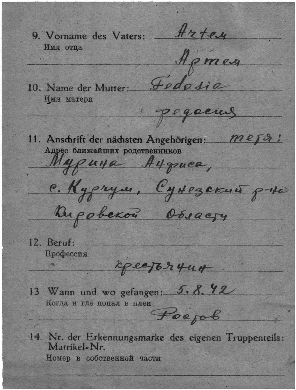 | Родился | 21.06.1921 | деревня Мурино (Сунский район, Кировская область) - существующий н.п. | д. Мурино, Муринский с/с, Сунской район, Кировская область, www.obd-memorial.ru |