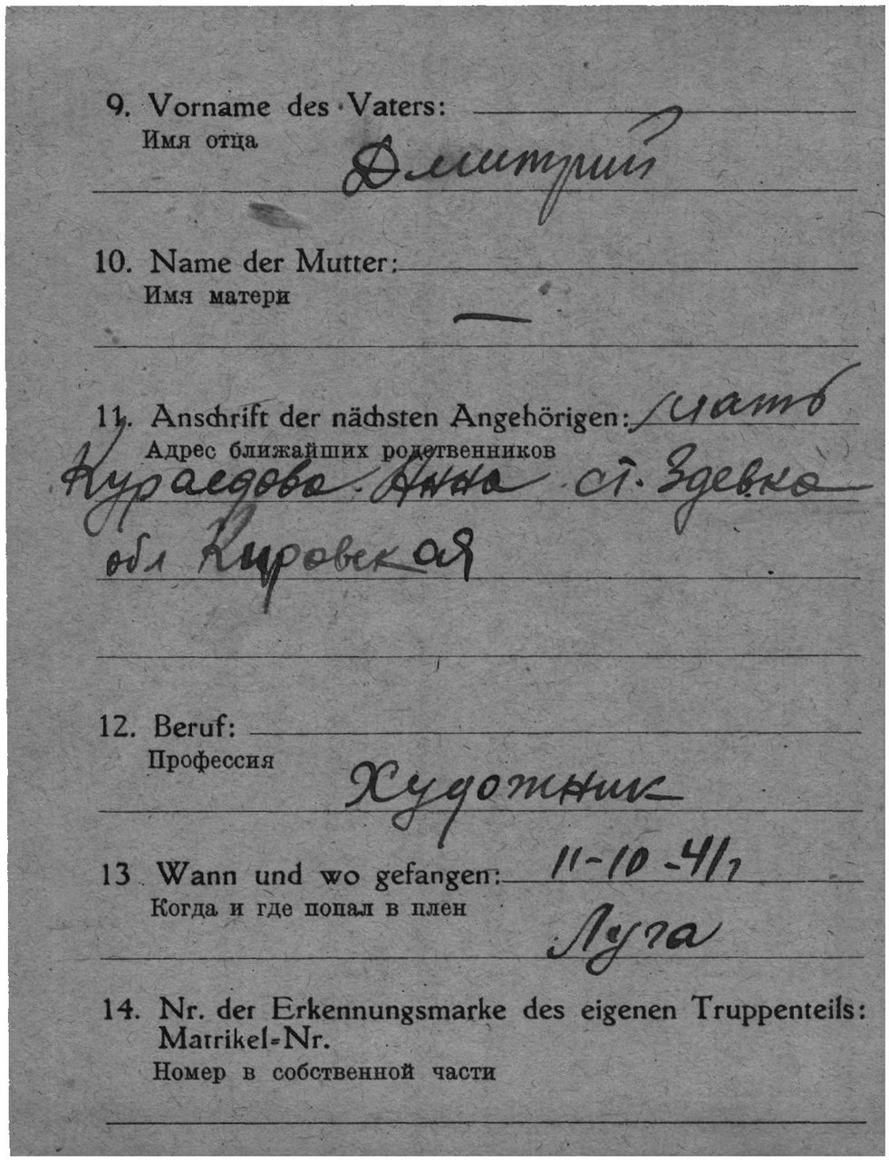 | Попал в плен | 11.09.1941 или 11.10.1941 | Луга | www.obd-memorial.ru |