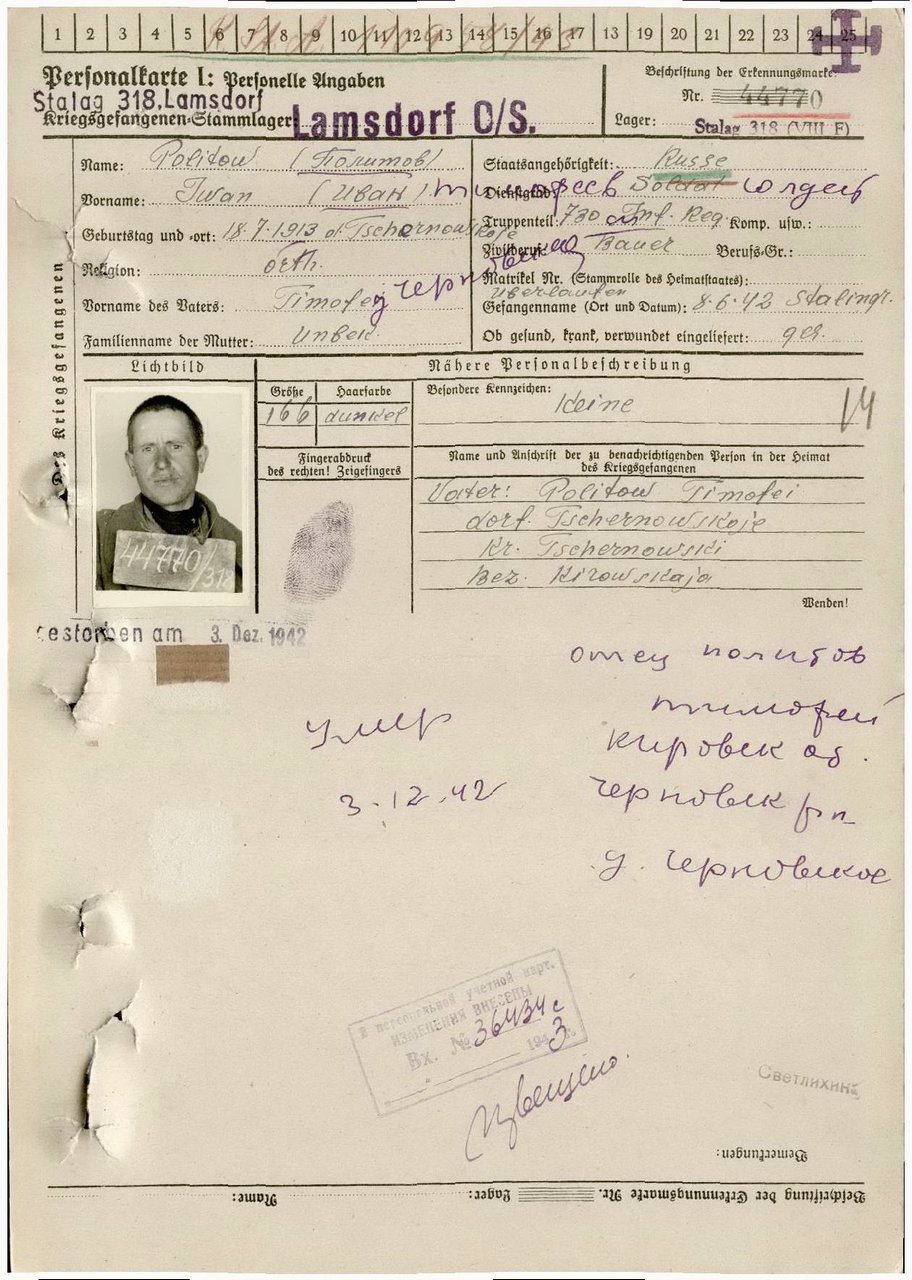| Умер | 03.12.1942 | Stalag VIII F (318) Lamsdorf (Ламбиновице, Польша) | Умер в немецком плену, в ревире лагеря военнопленных Ламсдорф. |