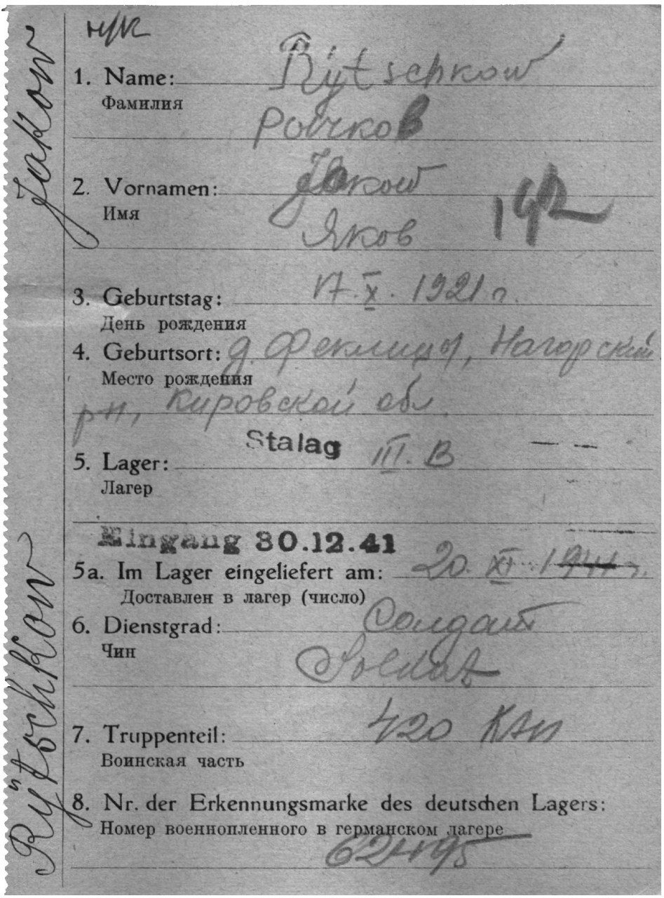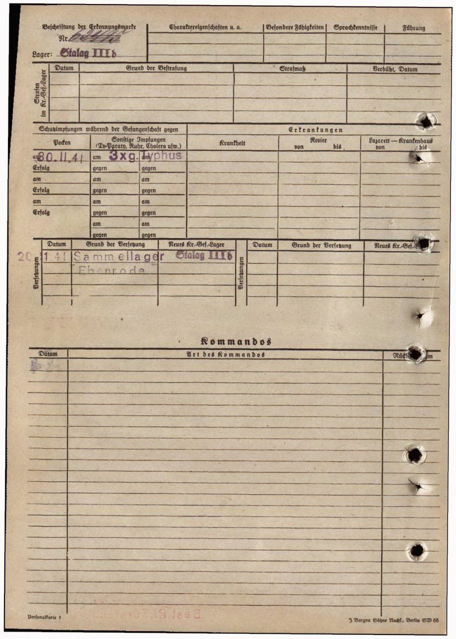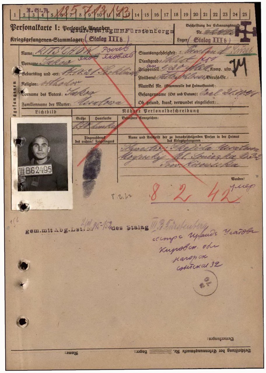 | Умер | 08.02.1942 | Stalag III B Fürstenberg an der Oder (Фюрстенберг на Одере, Германия) | Умер в немецком плену, в лагере военнопленных Фюрстенберг на Одере. В настоящее время это Айзенхюттенштадт (Eisenhüttenstadt). |