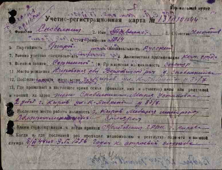 | Родился | 24.06.1914 юл/ст. | деревня Скобелкины (Чернопоповская, Черножоповская) (Юрьянский район, Кировская область) - ныне не существует | отец: Скобелкин Антон Федорович, мать: Скобелкина (Чудиновских) Ирина Даниловна (МК 1914 г. Покровской ц. с.Верходворье, ГАКО ф.237, оп.227, д.2833, л.142) |
