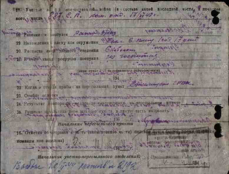 | Пленение | Сентябрь 1941 - Октябрь 1942 | "в плену 1 год 17 дней" (из уч.рег.карты ВПП 1944 г.) | |