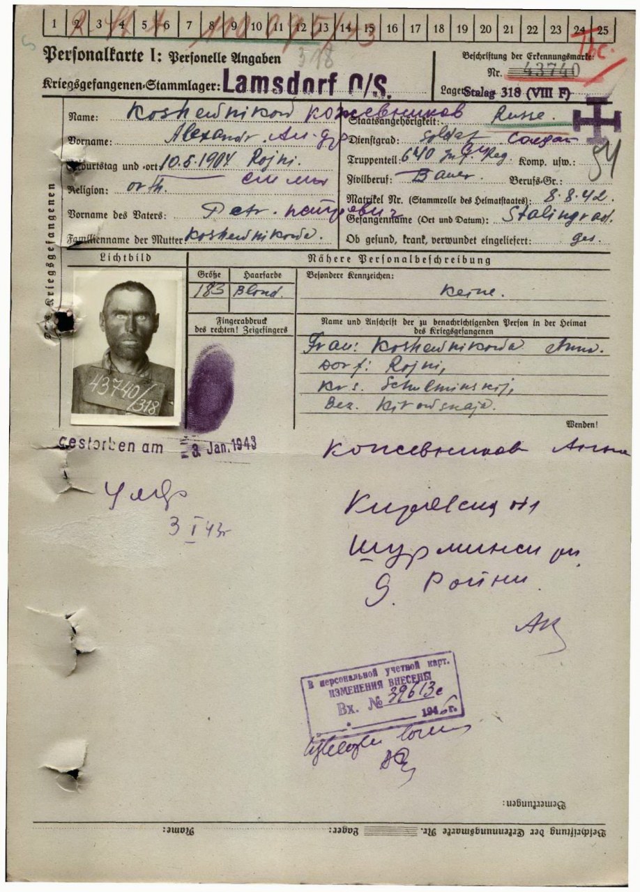 | Умер | 03.01.1943 | Stalag 318 Lamsdorf (Ламбиновице, Польша) | Умер в немецком плену, в лазарете лагеря военнопленных Ламсдорф. |