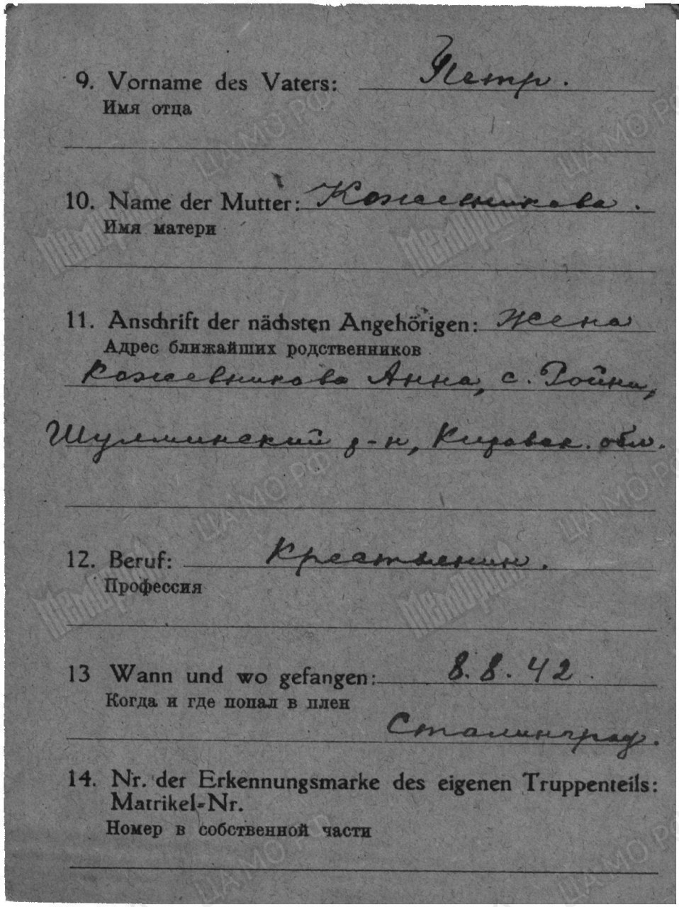 | Попал в плен | 08.08.1942 | Сталинград (Волгоград) | www.obd-memorial.ru |