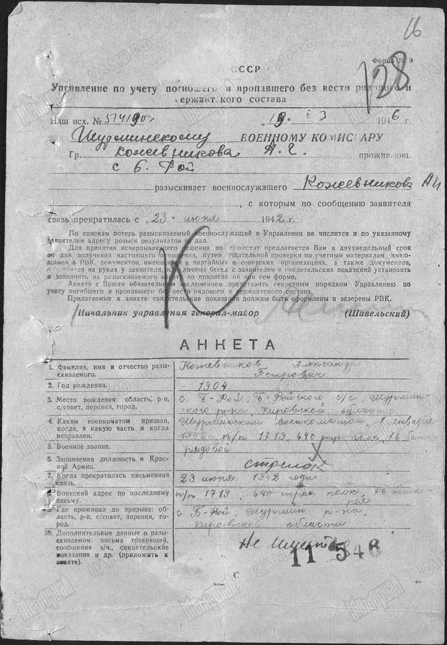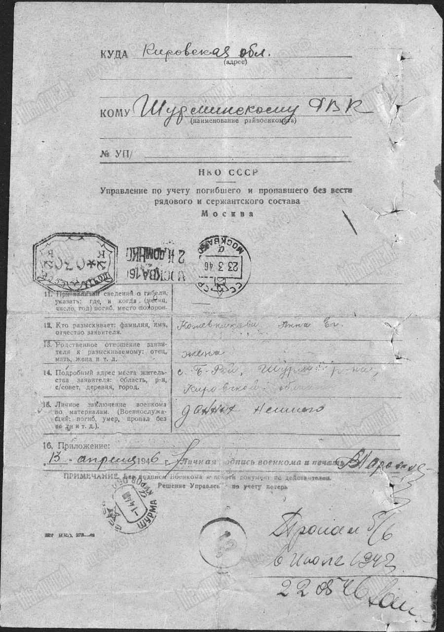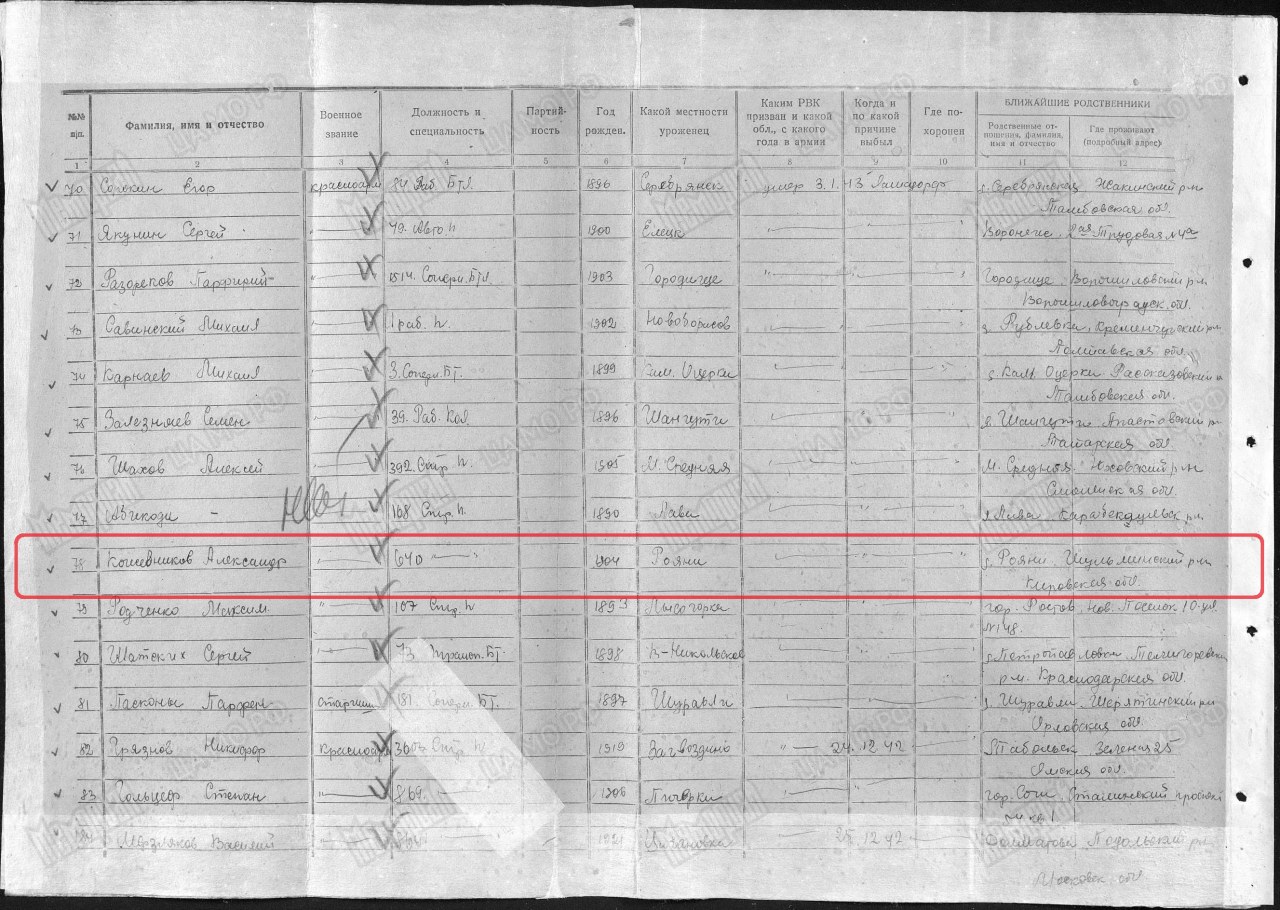 | Родился | 10.05.1904 | село Большой Рой (Уржумский район, Кировская область) - существующий н.п. | д. Б-Рой, Больше-Ройский с/с, Шурминский (Уржумский) район, Кировская область, www.obd-memorial.ru |