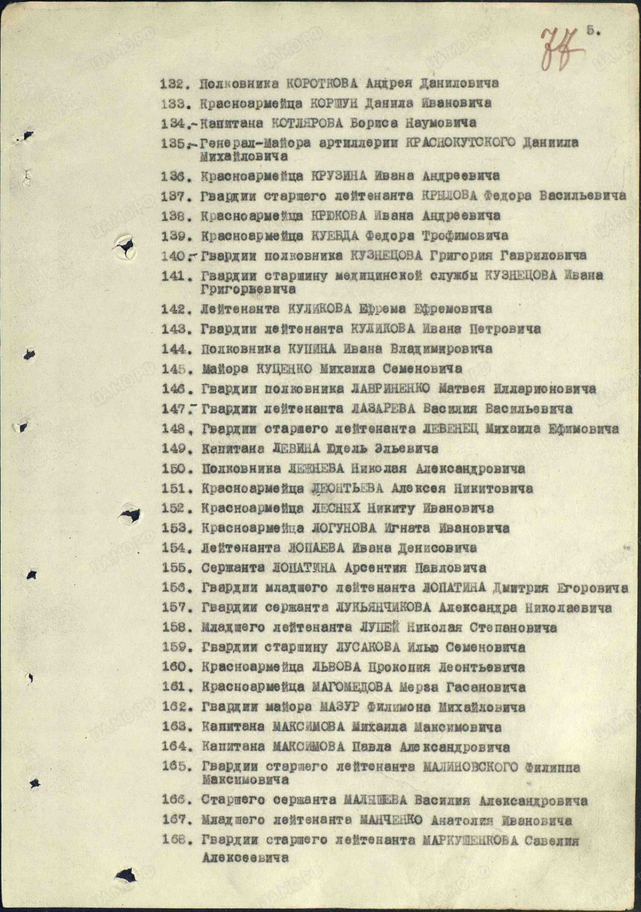 | Награждён: Орден Ленина | 10.01.1944 | Воинское звание: ст. сержант Воинская часть: 1212 иптап Наименование награды: Орден Ленина Приказ подразделения от: 10.01.1944 Издан: Президиум ВС СССР Информация об архиве - Архив: ЦАМО Фонд ист. информации: 33 Опись ист. информации: 686043 Дело ист. информации: 4 Информация об архиве - Архив: ЦАМО Картотека: Картотека награждений Расположение документа: шкаф 54, ящик 27 | |