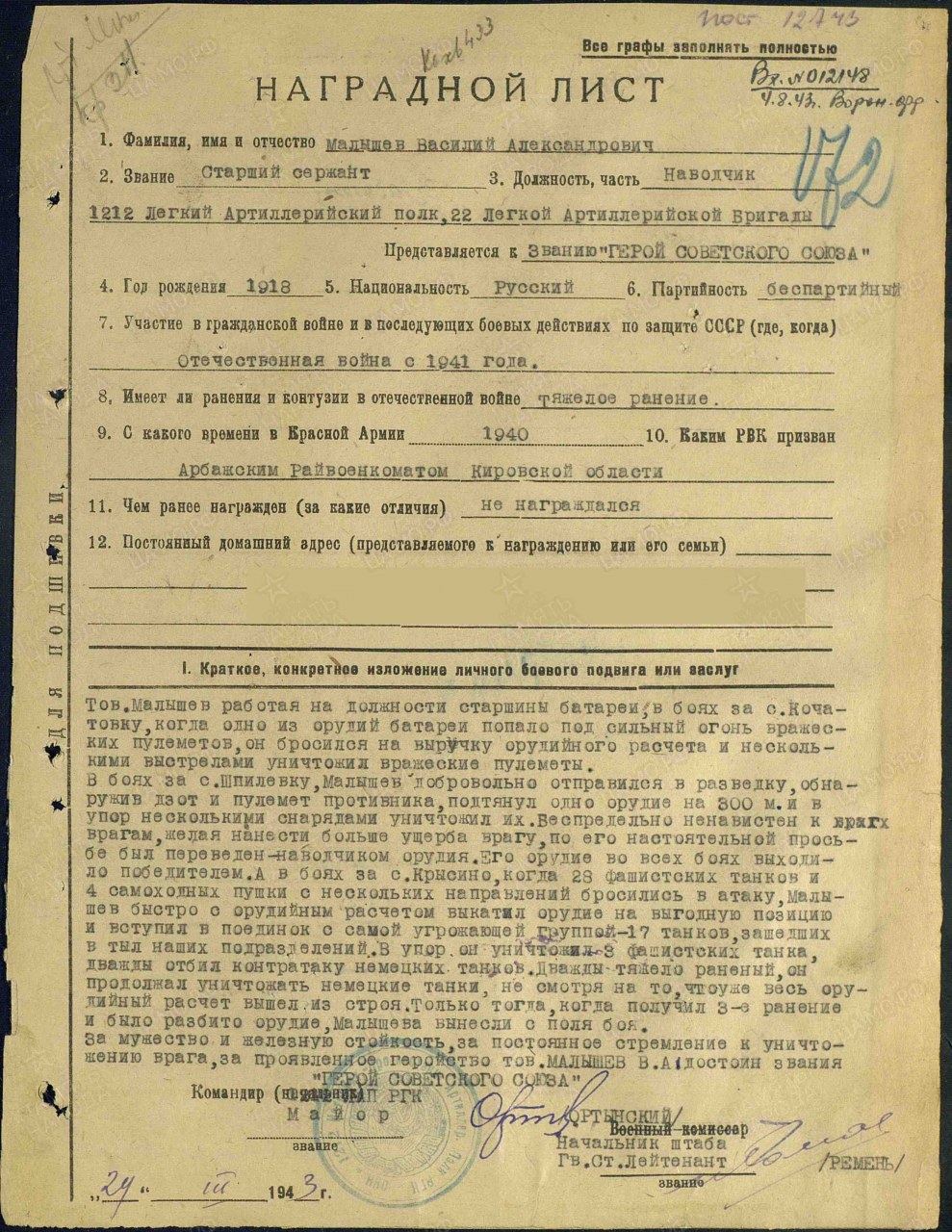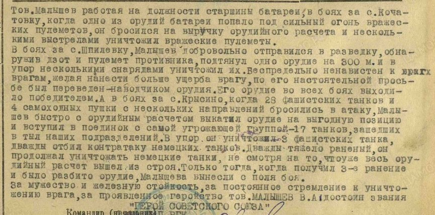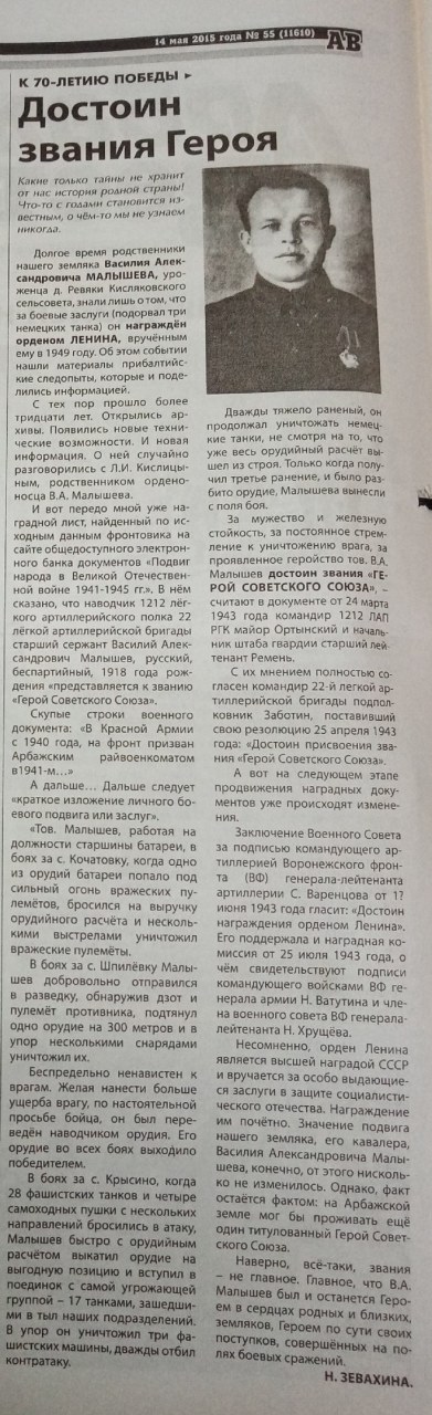 В газете "Арбажские вести" 2015г №55 о подвиге Василия Александровича Малышева и его фото в статье "Достоин звания героя".