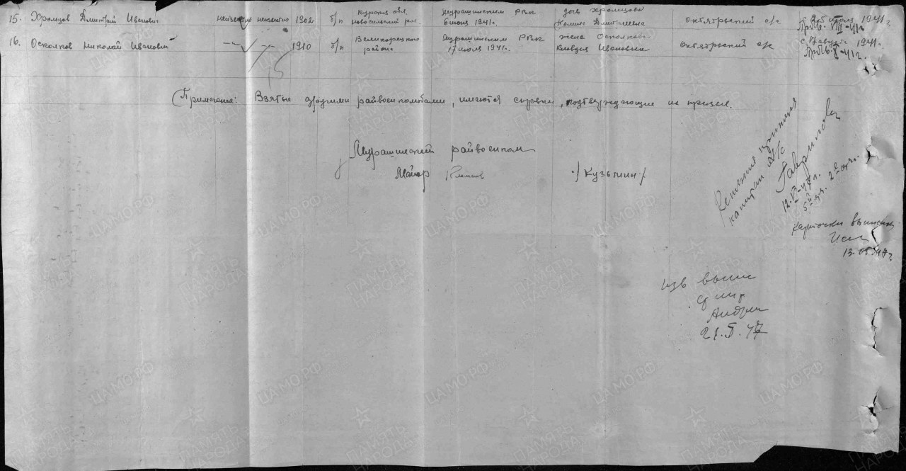 | призван Мурашинским РВК Кировской области | 06.06.1941 | город Мураши (Мурашинский район, Кировская область) - существующий н.п. | |