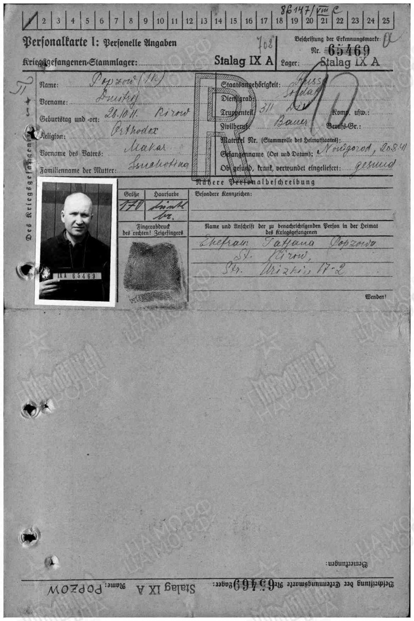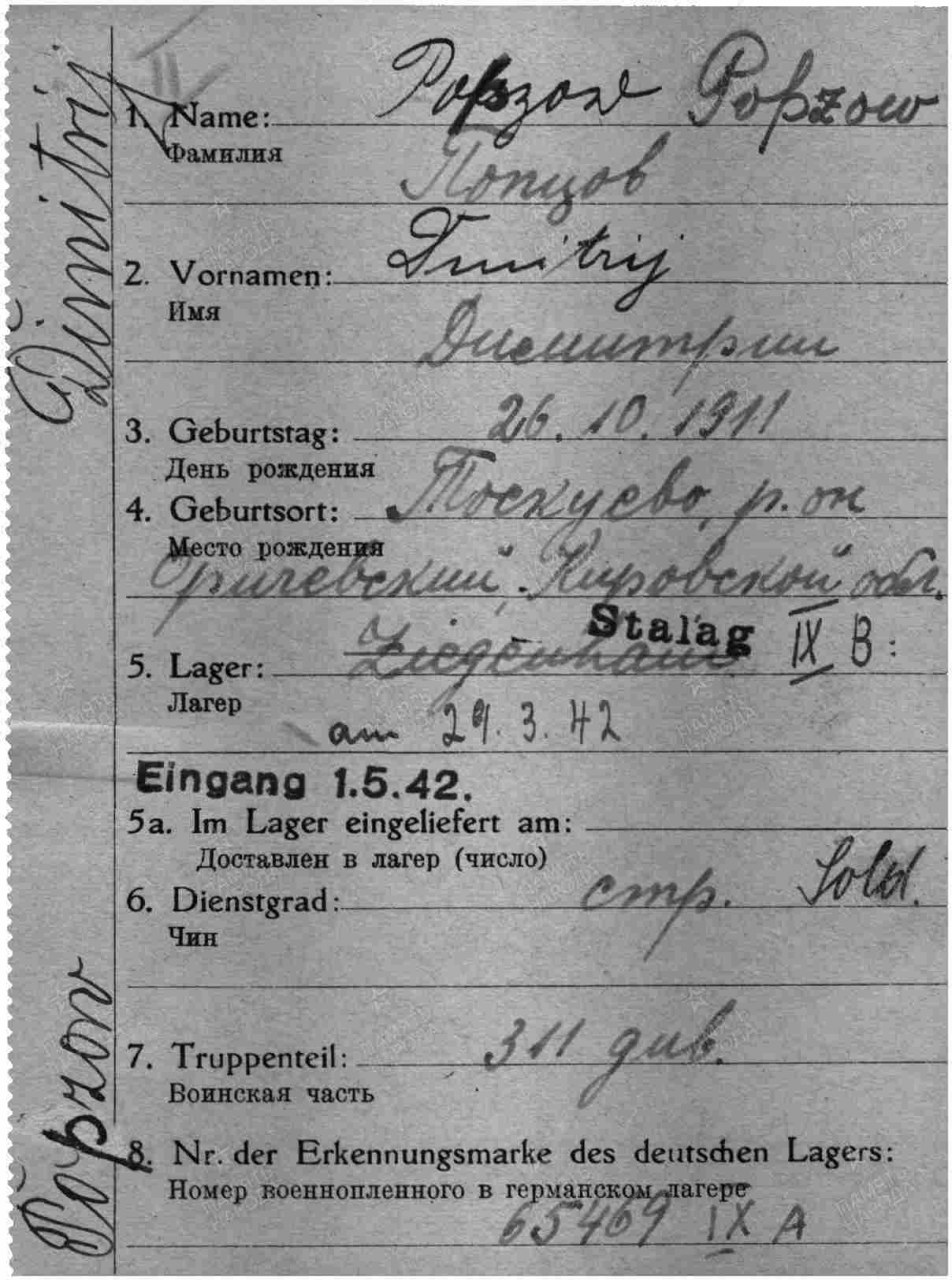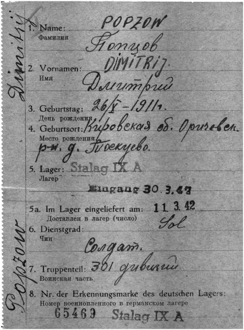 Попцов Дмитрий Макарович, 1911 г.р., из г. Кирова, мобилизован. Красноармеец, рядовой, 3 рота 1-й батальон 1067 сп 311 сд (принял присягу 24.07.1941 г. в г. Кирове, есть в раздаточной ведомости денежного содержания за июль 1941 г.). Попал в плен 20 (25).08.1941 г. под Новгородом. Лагерь: Германия, г. Заган. шталаг IX A/шталаг IX B/шталаг VIII C (на 04.1944 г.). Лагерный номер: 86147. Дальнейшая судьба неизвестна.
