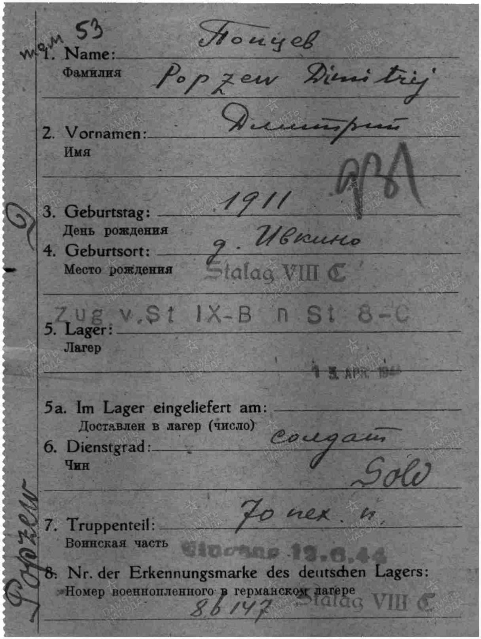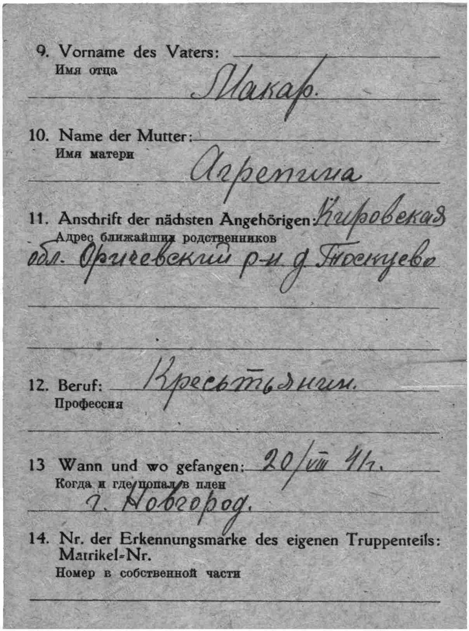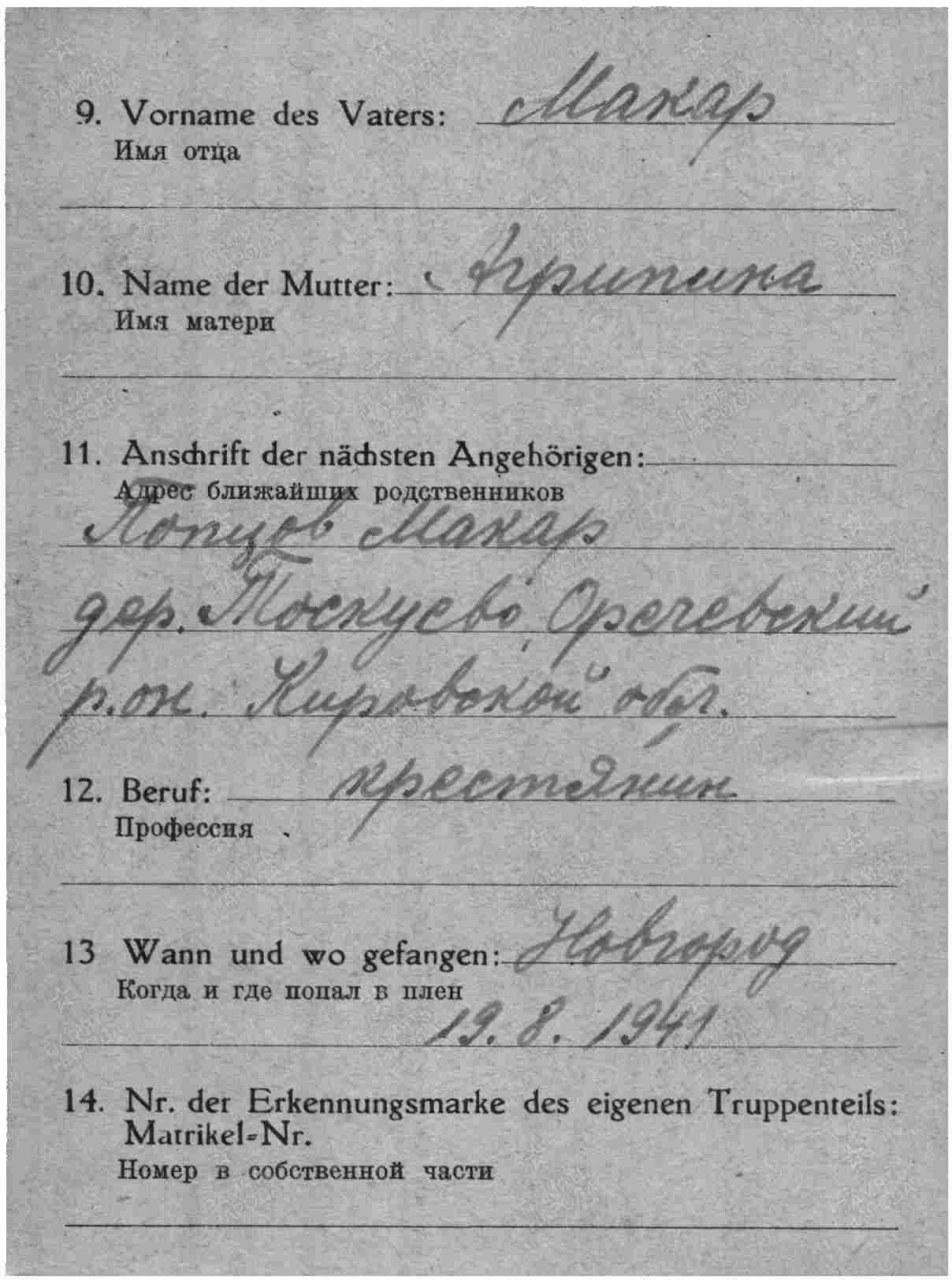 Попцов Дмитрий Макарович, 1911 г.р., из г. Кирова, мобилизован. Красноармеец, рядовой, 3 рота 1-й батальон 1067 сп 311 сд (принял присягу 24.07.1941 г. в г. Кирове, есть в раздаточной ведомости денежного содержания за июль 1941 г.). Попал в плен 20 (25).08.1941 г. под Новгородом. Лагерь: Германия, г. Заган. шталаг IX A/шталаг IX B/шталаг VIII C (на 04.1944 г.). Лагерный номер: 86147. Дальнейшая судьба неизвестна.