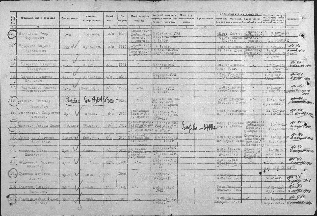 | 4313438012 | НЕСВЕТАЕВ Егор Федорович | 1920 г. р., из д. Зиненки Содомского с/с, красноармеец, стрелок. Пропал без вести 08.10.1945 г. | Кировская область, Шабалинский район |