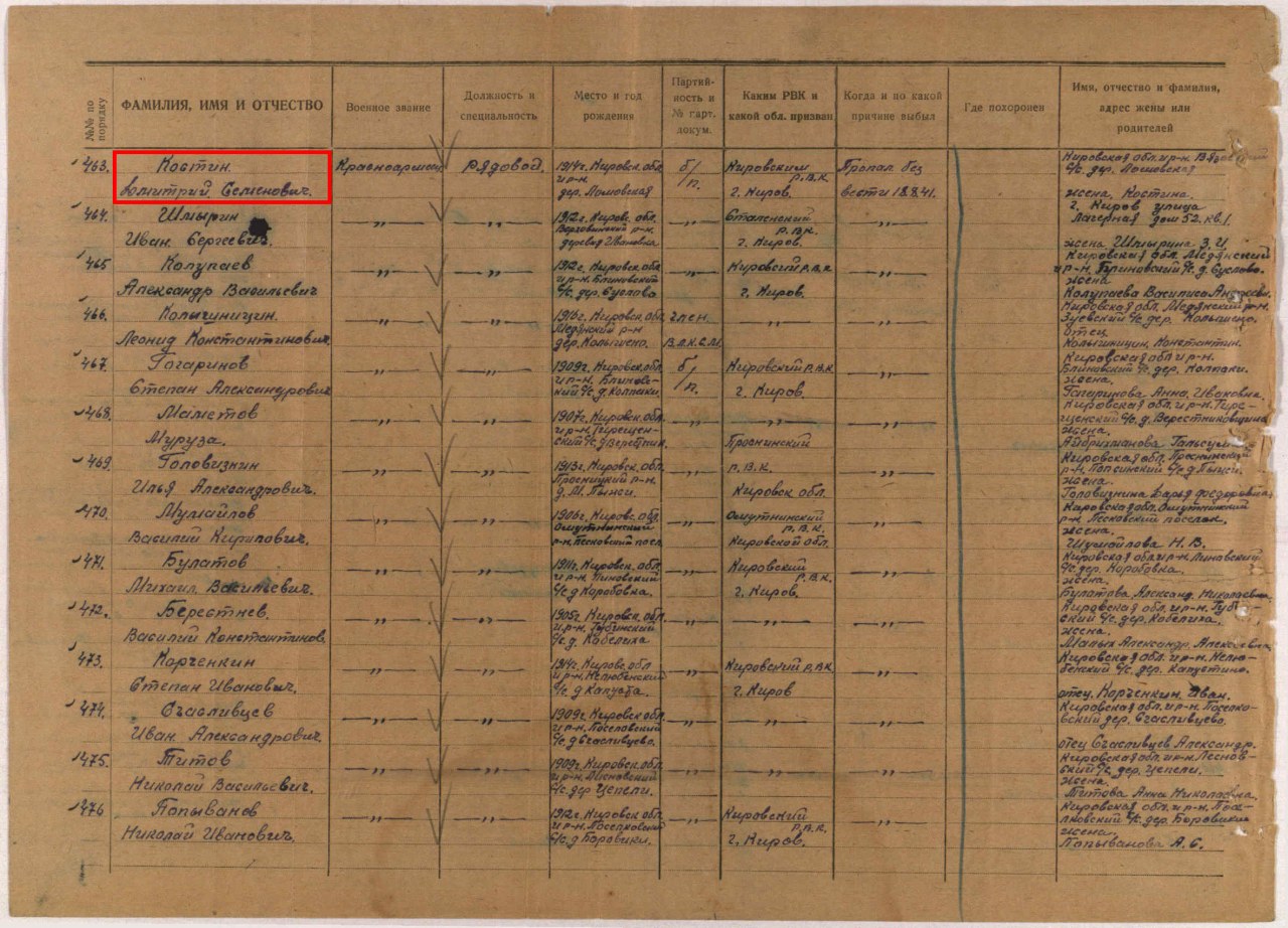 | Пропал без вести | 18.08.1941 | Чудово Новгородской обл. | |