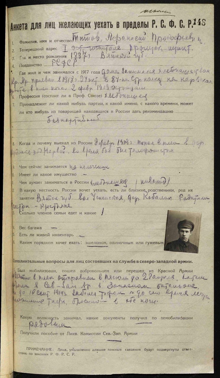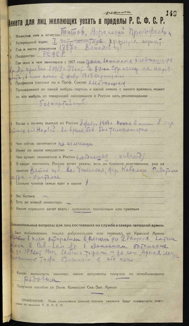 Анкета для лиц, желающих уехать в пределы РСФСР