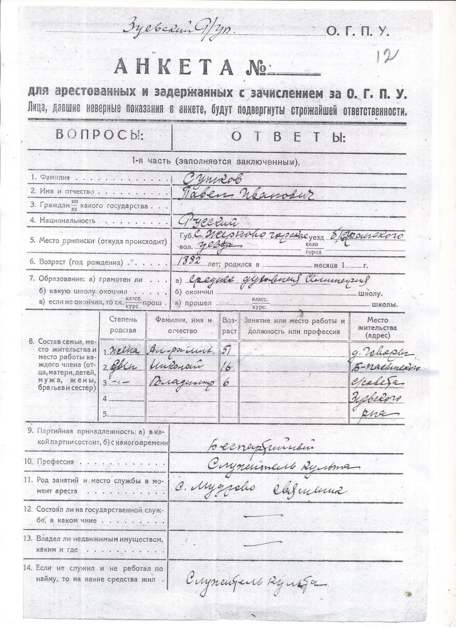 | 1931449 | Сушков Павел Иванович | Род. 1882, Горьковская обл., Советский р-н, с. Жерновогорское Национальность: русский Проживание: Зуевский р-н, д. Говоры, Большепасынский с/с Занятие: священник церкви в с. Мудрово Зуевского района. | Арест: 27.02.1933 Обвинение: по ст. 58 п. 10 УК РСФСР Осуждение: 22.04.1933, особая тройка при ПП ОГПУ Нижегородского края Приговор: заключению в концлагерь на 5 лет. | Дата: 15.08.1989 | Книга Памяти Кировской обл. (тт. 1-4) |
