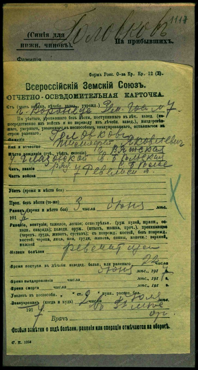 | Участие в 1-й Мировой войне | Между 1914 и Июнь 1917 | Должность/Звание рядовой Воинская часть 299-й пехотный Дубненский полк Место рождения Вятская губ., Глазовский уезд, Бельская вол., д. Гогли Причина выбытия пропал без вести Дата события 03.07.1915 Место события фольв. Графки Волынской губ. Тип документа Именные списки потерь Архив Российский Государственный Военно-исторический архив Фонд №16196, Особое делопроизводство по сбору и регистрации сведений о выбывших за смертью или за ранами, а также пропавших без вести воинских чинах, действующих против неприятельских армий (1914 - 1918) Опись №1, Именные списки потерь солдат и офицеров 1 мировой войны 1914-1918 гг. (по полкам и бригадам) Дело №490, Списки потерь солдат 299 пехотного Дубненского полка Документ №231588, Именной список потерь нижних чинов 299 пехотного Дубненского полка с 1 июля по 4 июля 1915 года, Автор: 299-й пехотный Дубненский полк, 1915-09-05 Должность/Звание рядовой Воинская часть 299-й пехотный Дубненский полк Место рождения Вятская губ., Глазовский уезд, Бельская вол., д. Гобли Причина выбытия ранен/контужен Дата выбытия 27.07.1915 Дата события 27.07.1915 Место события г. Рубельск Тип документа Карточка на прибывших (высшие чины) Архив Российский Государственный Военно-исторический архив Фонд Картотека бюро учета потерь в Первой мировой войне (офицеров и солдат) Шкаф без номера Ящик 790-Г Должность/Звание рядовой Воинская часть 7-й пехотный Ревельский полк Место рождения. Губерния Вятская губ. Место рождения. Уезд Глазовский уезд Место рождения. Волость Бельская вол. Причина выбытия болен Дата события 22.06.1917 Тип документа Отчетно-осведомительные карточки Архив Российский Государственный Военно-исторический архив Фонд Картотека бюро учета потерь в Первой мировой войне (офицеров и солдат) Шкаф без номера Ящик 673-Г | |