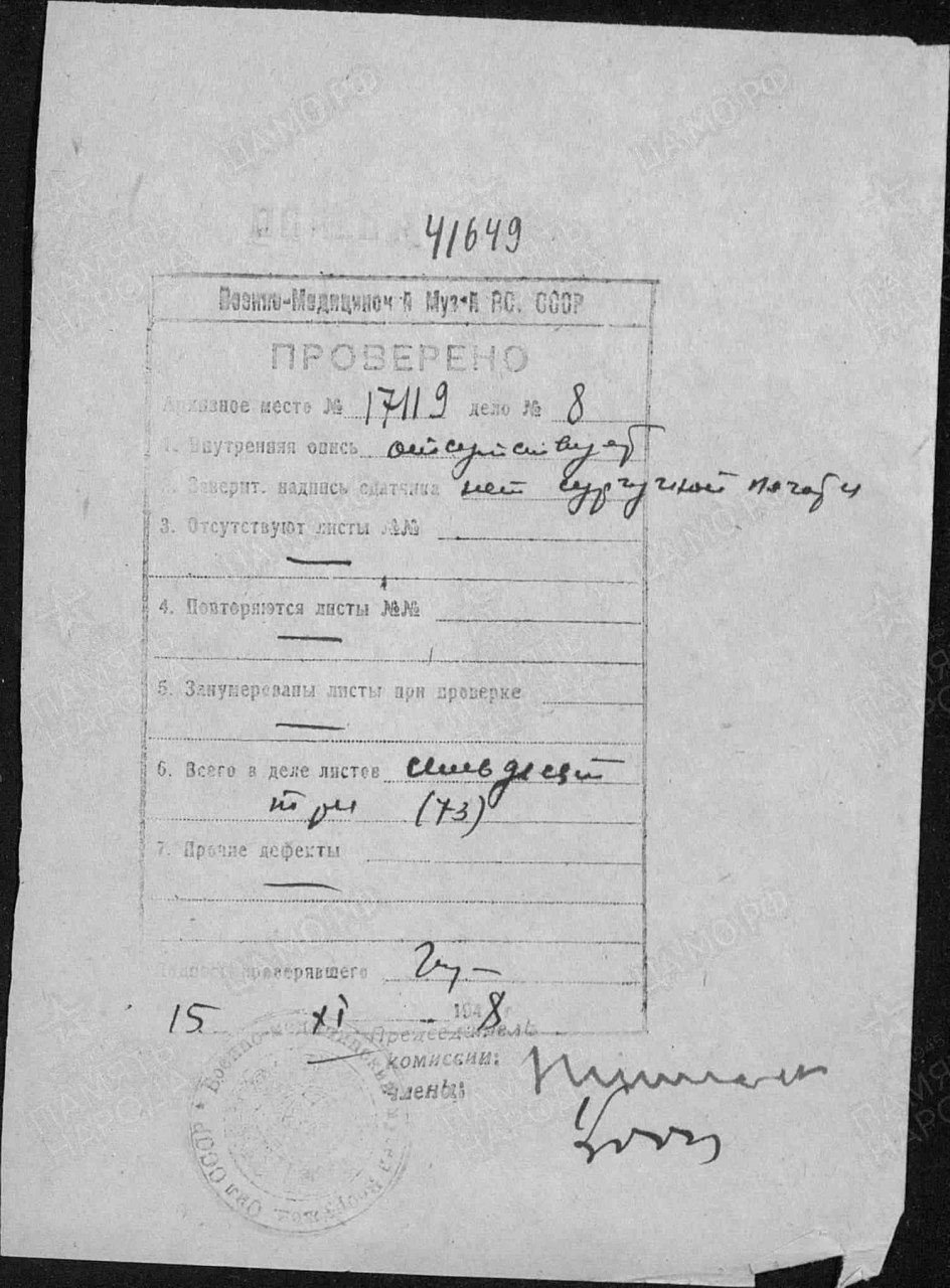| Умер | Июнь 1942 | г. Калинин Калининская область | умер от ран в Эвакогоспитале-3829 (Тип лечебного учреждения: Эвакуационный госпиталь Место дислокации: Калинин Район дислокации: Калининская область Лечебное учреждение находилось в этом районе с 26.01.1942 по 20.10.1943) |
