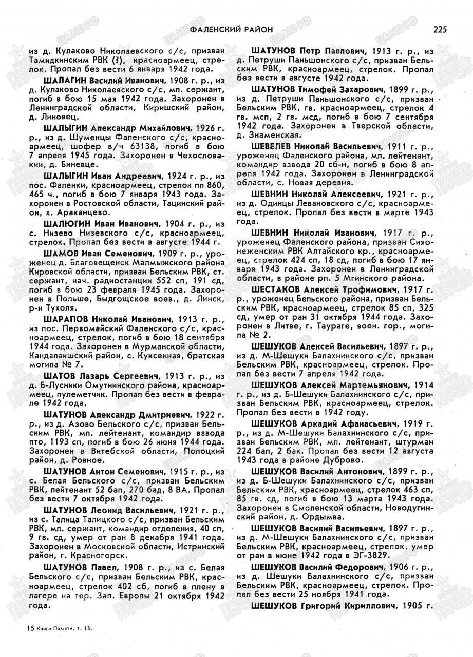 | 4313225022 | ШЕШУКОВ Василий Васильевич | 1897 г. р., из д. М-Шешуки Балахнинского с/с, призван Бельским РВК, красноармеец, стрелок, умер от ран в июне 1942 года в ЭГ-3829. | Кировская область, Фаленский район |