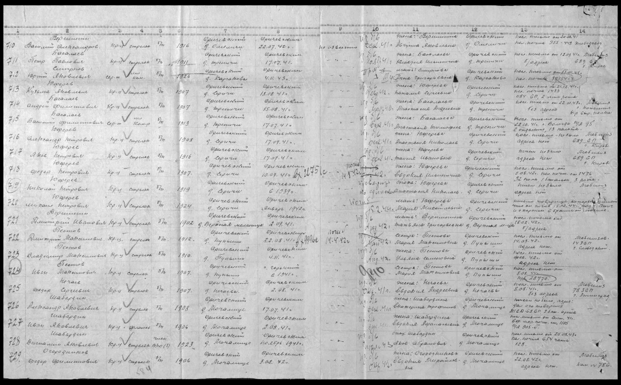 | 4308494004 | ЮФЕРЕВ Александр Петрович | 1908 г. р., Брагинский с/с, красноармеец, стрелок, 689 сп, г. Киров, в декабре 1941 г. пропал без вести. | Кировская область, Оричевский район | |||