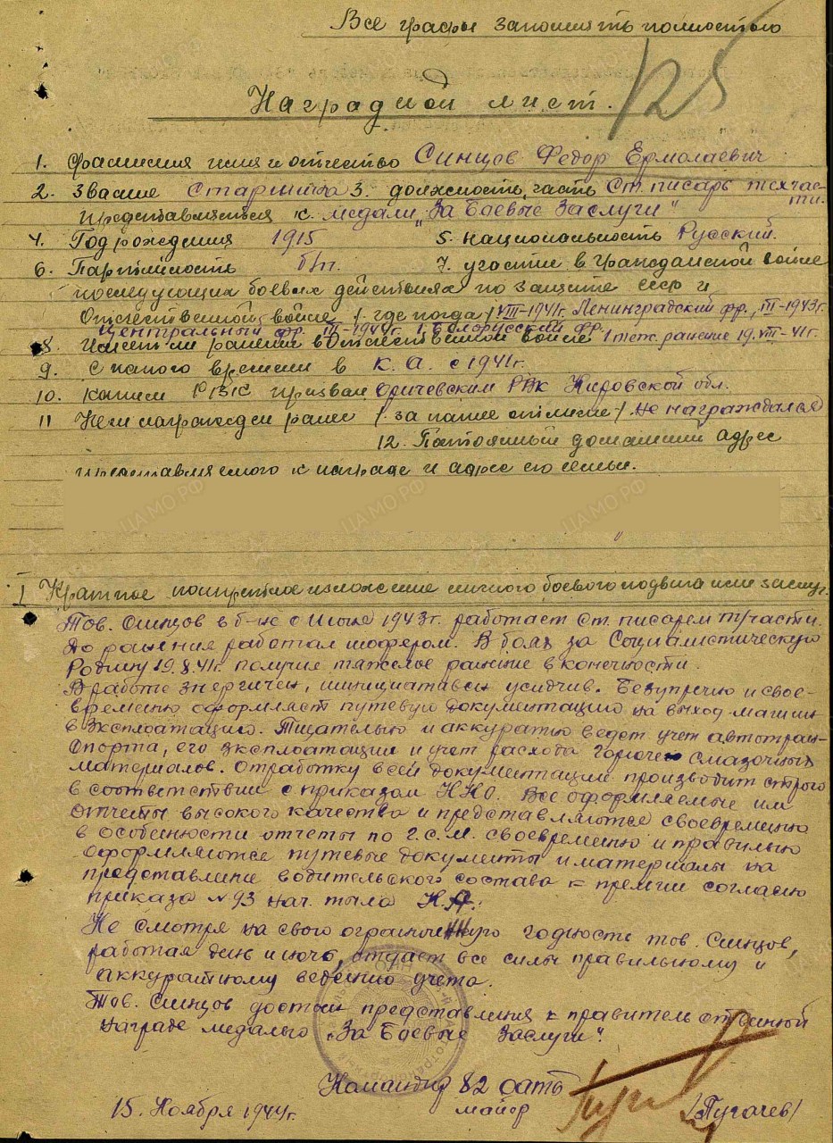 | Награждён: Медаль «За боевые заслуги» | 11.12.1944 | Приказ № 235/н по ВС 70 А 2 Белорусского фронта |