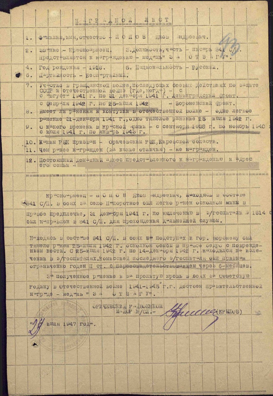 Попов Яков Андреевич, 1918 г.р., уроженец д. Трапицыны Трапицынского с/с Оричевского района. Член ВЛКСМ. Служил в РККА с 09.1938 г. по 11.1940 г. Мобилизован 18.07.1941 г. Оричевским РВК в 689 сп. Фактически: красноармеец, 311 сд (предполагается). Ранен 31.12.1941 г. легко (Ленинградский фронт). Красноармеец, писарь, 841 сп. Тяжелое ранение 25.07.1942 г. Проходил лечение в госпитале ЭГ 1107, ЭГ 2549 до 9(14).12.1942 г. Признан ограниченно годным. Награды: медаль "За отвагу" (1947 г.).