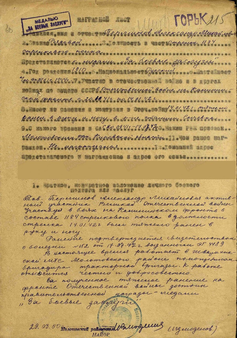 | участие в Великой Отечественной войне | 1941 - 1943 | Дата рождения __.__.1910 Место рождения Кировская обл., Молотовский р-н Место призыва Молотовский РВК, Кировская обл., Молотовский р-н Дата поступления на службу: 20.09.1941 Воинское звание рядовой ; красноармеец Воинская часть 1184 стрелковый полк 355 стрелковой дивизии (I) Награды Медаль «За боевые заслуги» (2) | |
