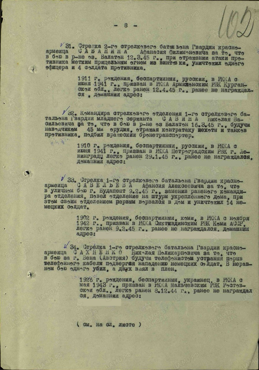 | Награждён: Медаль «За отвагу» | 17.05.1945 | Воинское звание: гв. красноармеец Воинская часть: 305 гв. сп Наименование награды: Медаль «За отвагу» Приказ подразделения №: 9/н от: 17.06.1945 Издан: 305 гв. сп 108 гв. сд 3 Украинского фронта Информация об архиве - Архив: ЦАМО Фонд ист. информации: 33 Опись ист. информации: 687572 Дело ист. информации: 2438 Информация об архиве - Архив: ЦАМО Картотека: Картотека награждений Расположение документа: шкаф 77а, ящик 9 | |