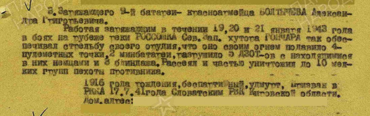 | 4310271019 | БОЛТАЧЕВ Александр Григорьевич | 1916 г. р., д. Н. Мочагино Кругловского с/с. Призван Слободским РВК. Красноармеец 1069 сп, 311 сд. Пропал без вести 20.08.1941 г. в районе Чудово Новгородской обл. Комментарий: Ошибочно внесен в Книгу Памяти. По данным сайта Память народа был награжден в 1943 и 1945 годах | Кировская область, Слободской район |