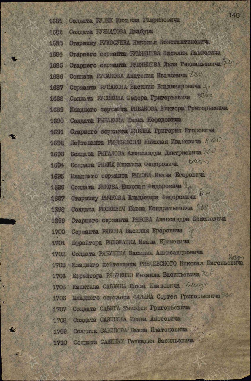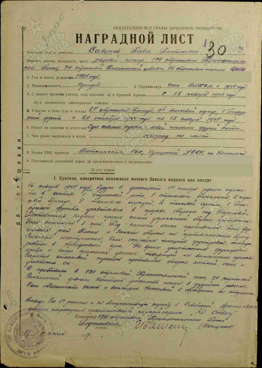 | Награждён: Медаль «За боевые заслуги» | 06.11.1947 | Воинское звание: красноармеец Воинская часть: 179 сп Кто наградил: Президиум ВС СССР Наименование награды: Медаль «За боевые заслуги» Номер документа: 223/163 Дата документа: 06.11.1947 Место призыва: Воткинский РВК, Удмуртская АССР, Воткинский р-н Приказ подразделения №: 223/163 от: 06.11.1947 Издан: Президиум ВС СССР Информация об архиве - Архив: ЦАМО Фонд ист. информации: 33 Опись ист. информации: 744808 Дело ист. информации: 1906,128 |