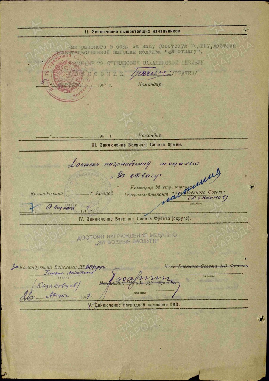 | участие в Великой Отечественной войне | 18.01.1943 - 09.05.1945 | Красноармеец. Воинская часть: 179 стрелковый полк 79 стрелковой дивизии, | |