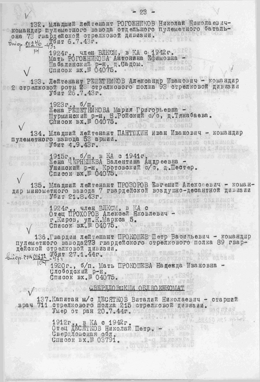 | 4312117005 | ПАНТЮХИН Иван Иванович | 1915 г. р., из д. Ст.-Уни Унинского с/с, мл. лейтенант, ком. пулеметного взвода, 928 сп, 252 сд, погиб в бою 04.09.1943 г. | Кировская область, Унинский район |
