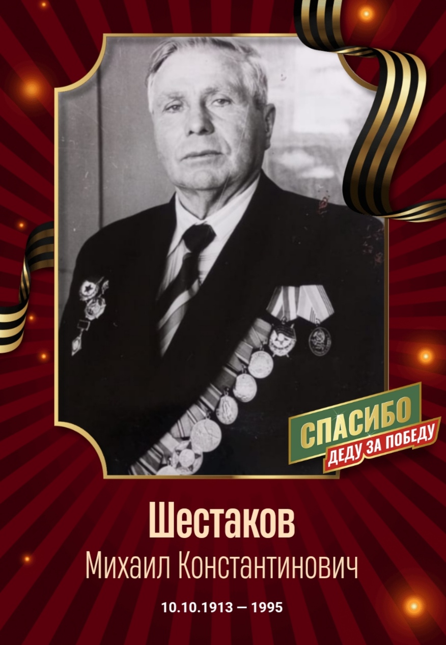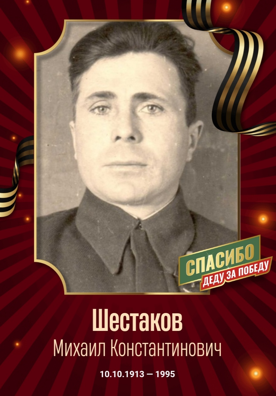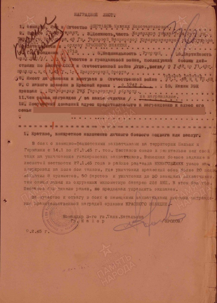 | Награждён: Подвиг | - | За что награждён «... в боях с немецко-фашистскими захватчиками на территории Польши и Германии с 14.1 по 27.1.45 г. тов. Шестаков смело и решительно вел свой танк на уничтожение гитлеровских захватчиков. Выполняя боевое задание в лесистой местности 27.1.45 года в районе раз"езда" КЕНИГСБЛИКК умело маневрировал на поле боях танком, где уничтожил вражеский обоз более 20 подво захватил 8 пулеметов, 50 фаустов и уничтожил до 30 немецких захватчиков тем самым вывел из окружения минометную батарею 226 АМП. в этом бою тов. Шестаков был тяжело ранен, но продолжал управлять экипажем. ...» | |