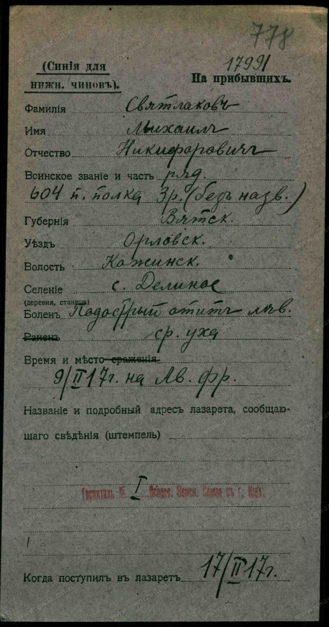 | Лечение | 09.02.1917 | Киев | Воинское звание: рядовой. 09.02.1917 г. во время нахождения на Австрийском фронте в составе 604-го пехотного полка проявилась болезнь (как последствие ранения) - подострый отит левого среднего уха. В связи с чем 17.02.1917 поступил в Госпиталь № 1 Всероссийского земского союза по оказанию помощи больным и раненым воинам в г. Киеве. Источники информации: 1. Сайт https://gwar.mil.ru 2. Российский Государственный Военно-исторический архив (РГВИА): Фонд Картотека бюро учета потерь в Первой мировой войне (офицеров и солдат), Шкаф без номера, Ящик 3069-С. |