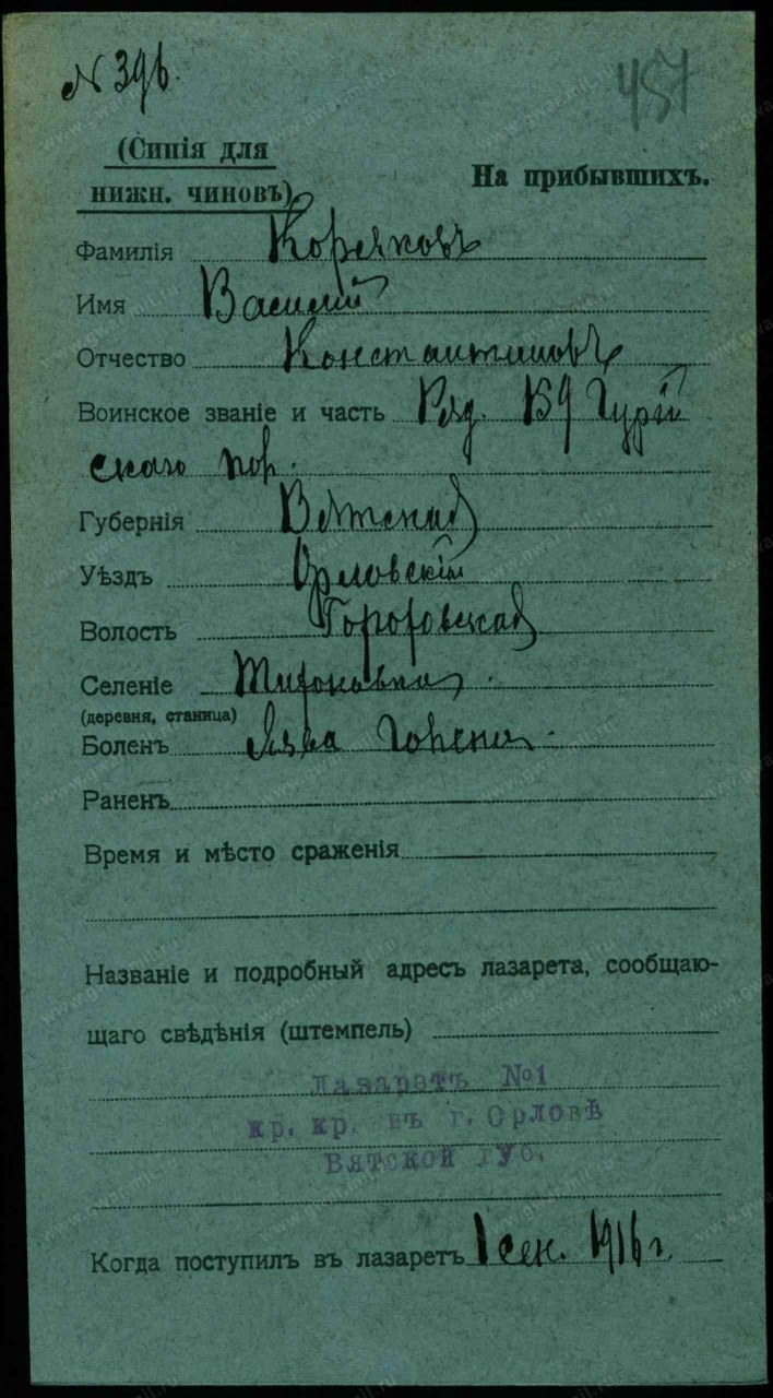 | участие в Первой Мировой войне | 1914 - 1918 | Должность/Звание рядовой Воинская часть 159-й пехотный Гурийский полк Место рождения Вятская губ., Орловский уезд, Гороховская вол., н.п. Тихоновка Причина выбытия болен Дата события 01.09.1916 Тип документа Карточка на прибывших (нижние чины) Архив Российский Государственный Военно-исторический архив Фонд Картотека бюро учета потерь в Первой мировой войне (офицеров и солдат) Шкаф без номера Ящик 1584-К |