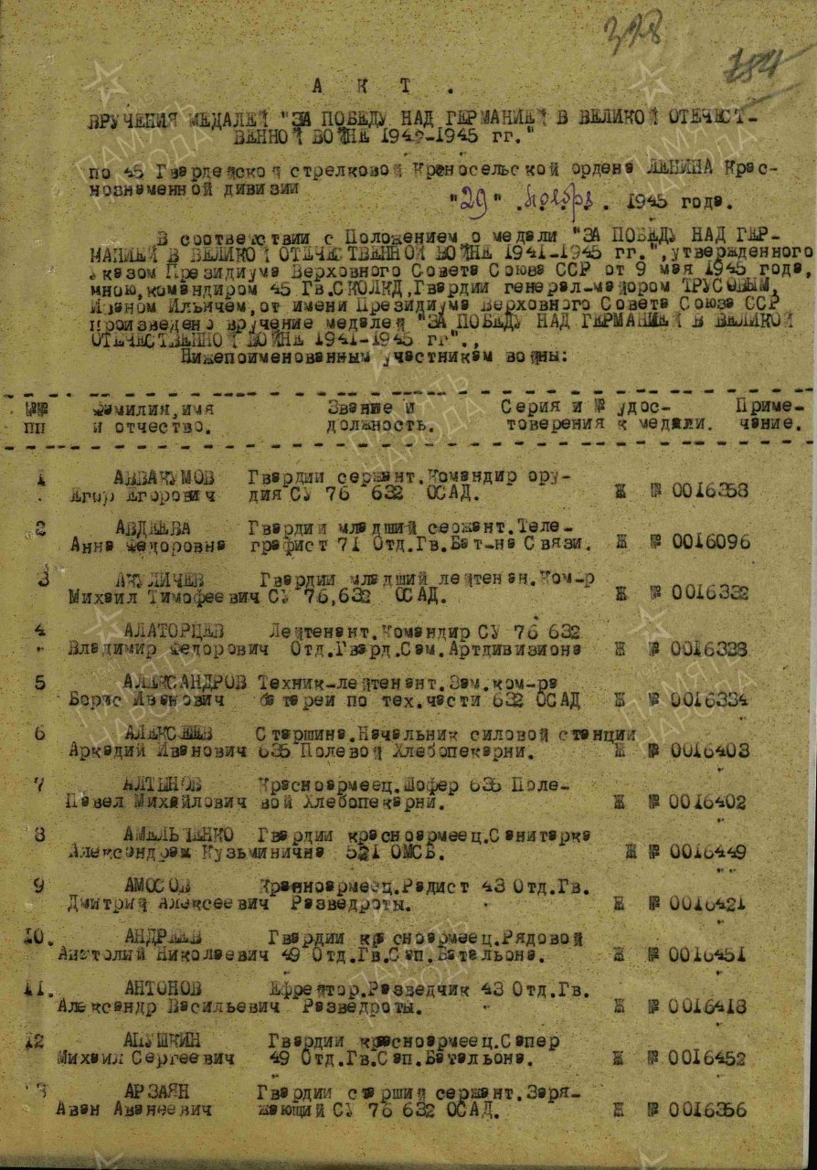 Награжден: орден "Красной звезды" приказ № 040/н от 04.08.1944 г. ВС 3-го Прибалтийского фронта,