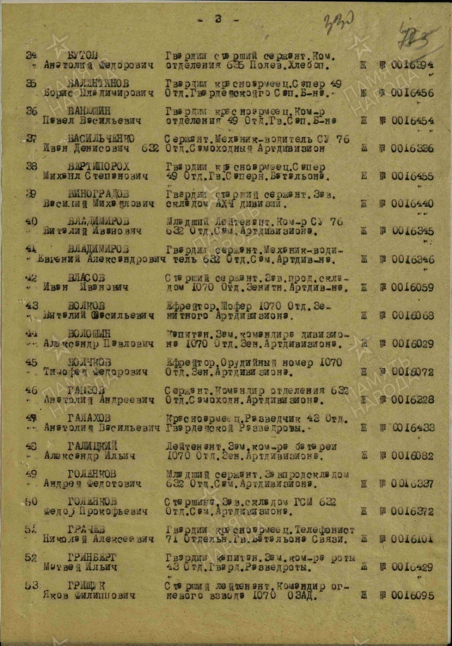 орден "Славы III ст." приказ № 0359/н от 20.10.1944 г. ВС 1-й Ударной Армии (не вручен),