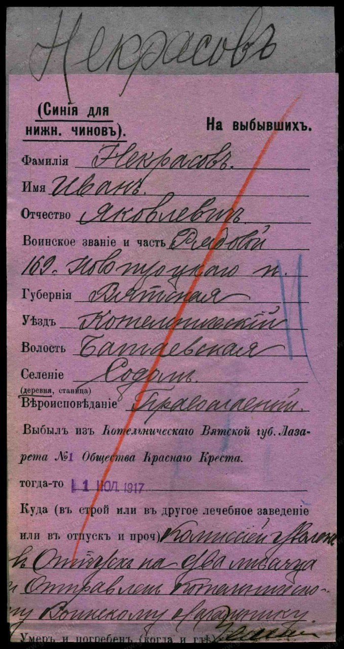 | Демобилизация | - | Должность/Звание рядовой Воинская часть 169-й пехотный Ново-Трокский полк Место рождения Вятская губ., Котельничский уезд, Батаевская вол., д. Содом Причина выбытия не уточнено Место выбытия комиссией уволен в отпуск на два месяцаи отправлен Котельническому воинскому начальнику Тип документа Карточка на выбывших (нижние чины) Архив Российский Государственный Военно-исторический архив Фонд Картотека бюро учета потерь в Первой мировой войне (офицеров и солдат) Шкаф без номера Ящик 453-Б |